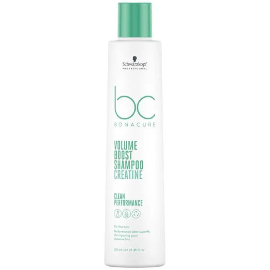 BC Bonacure Volume Boost Shampoo er en rensende shampoo for tynt og fint hår. Fjerner skånsomt overflødig olje og rester som kan tynge. Pleiepolymerer forhindrer statisk elektrisitet og gir bedret håndterbarhet mens emulgatorer sørger både for den gellignende konsistensen samt fyldigere følelse og motstand. Sammensetningene med Kreatin gjenoppretter hårfibrene og kombinert med med Cell Equalizer glattes håroverflaten for smidighet, håndterbarhet, spenst og glans. Håret får volum og fylde i opptil 48 timer. Serien forbedrer volum ihvert enkelt hårstrå.