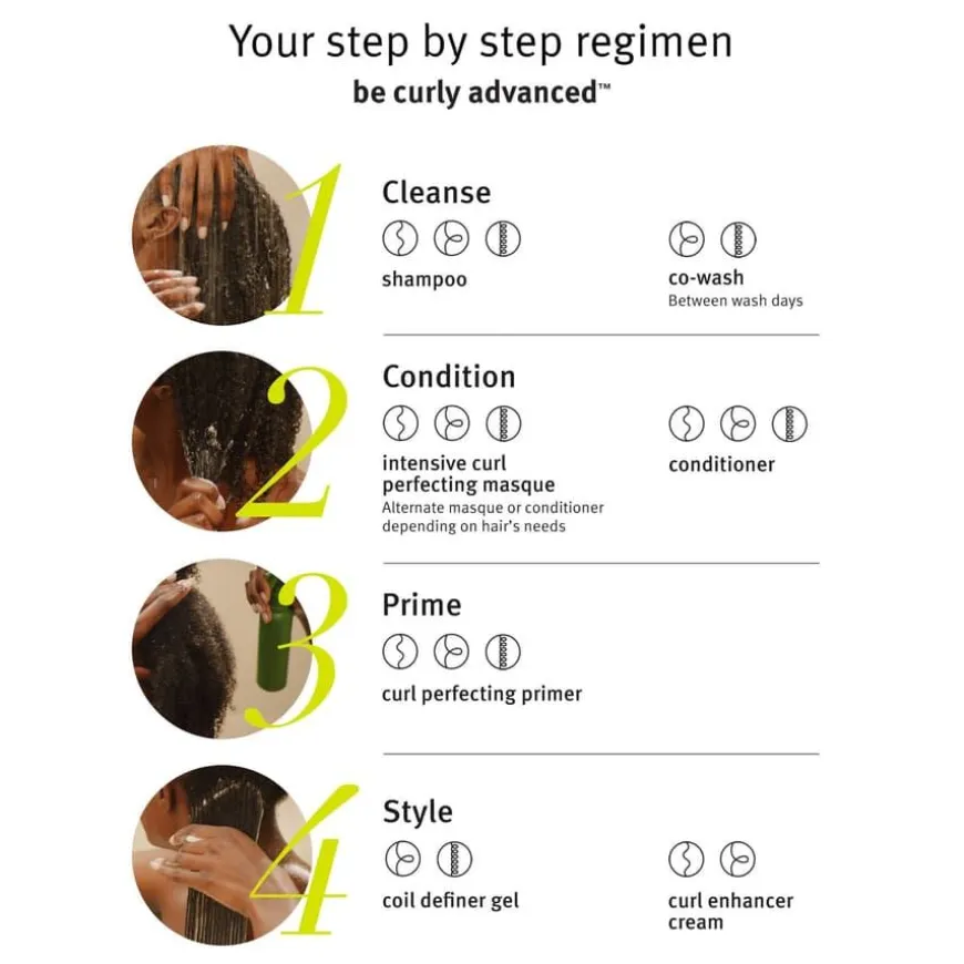 - På hårvaskdager, bruk be curly advanced™ shampoo, intensive curl perfecting masque og curl perfecting primer, deretter style med coil definer gel.