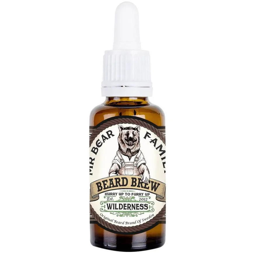 Beard Brew Wilderness er en skjeggolje laget av naturlige oljer, som mandel og arganolje. Disse oljene mykner og pleier både hud og skjegg. Skjegget etterlates glatt og fyldig. Oljen lindrer kløe, hudirritasjon, rødhet og tørr hud. Den har en herlig duft av frodig grønn eng og skog.