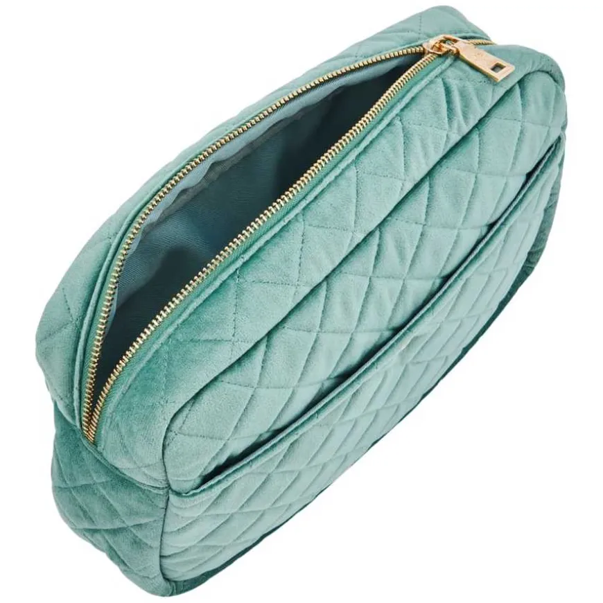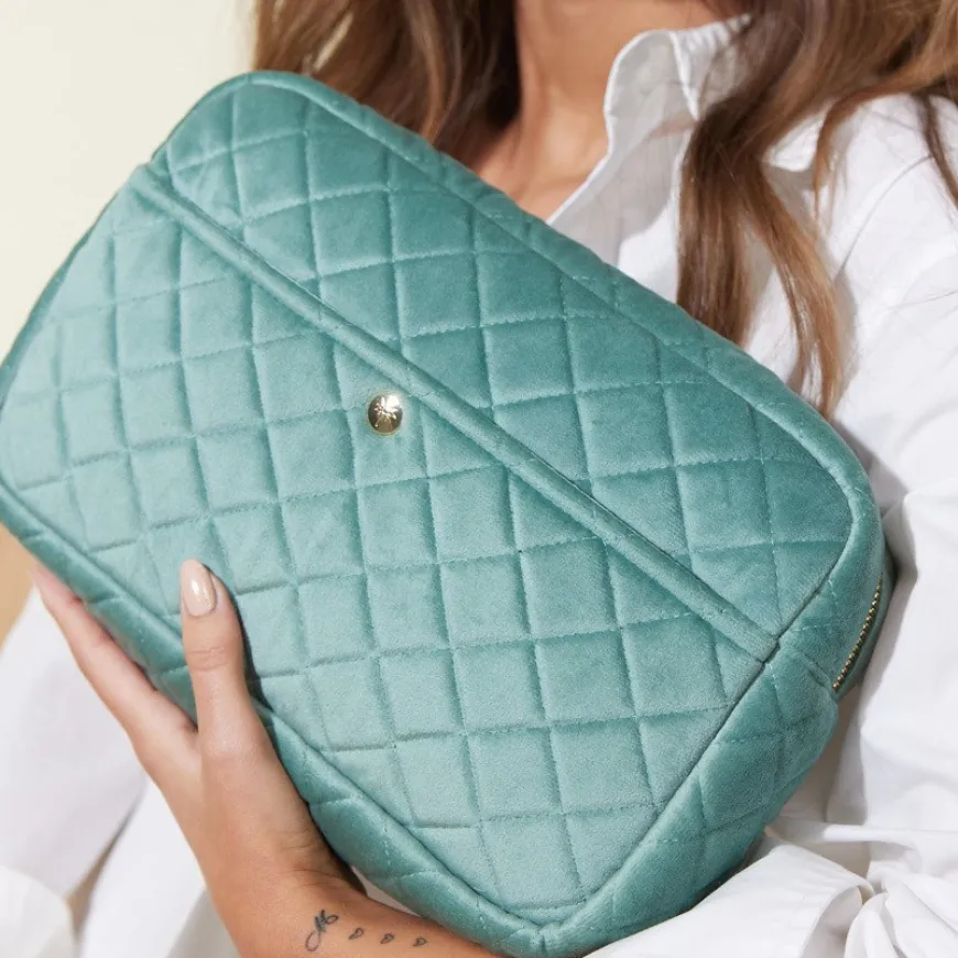 Beauty Bag Mint Green Large er en stor, myk skjønnhetsveske tilgjengelig i en rekke nydelige materialer og farger for hver sesong. Noen vesker er ideelle for reise, mens andre passer perfekt til hjemmebruk. De har god plass til shampoo, børster, kosmetikk og kremer. Vesken har en Fan Palm-merket gullglidelås og en preget palm logo-knapp. Denne skjønnhetsvesken er perfekt for alle slags eventyr.