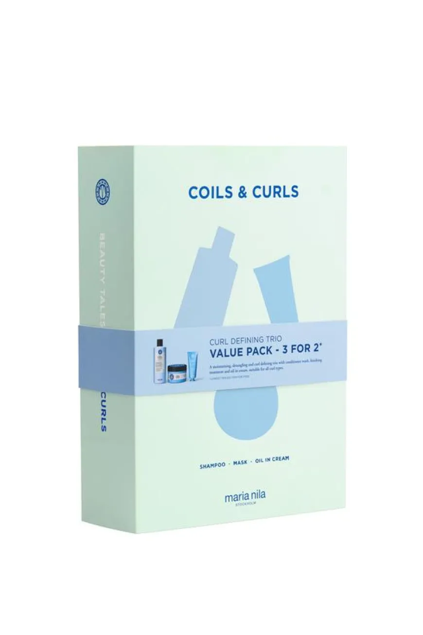 Maria Nila Beauty Box Coils & Curls Set er en del av Coils & Curls-serien, og tilbyr en fullstendig hårpleierutine for krøller. Settet inneholder Co-Wash (350ml), en fuktighetsgivende balsamvask som både renser og pleier håret, Finishing Treatment Masque (250ml), en dypt nærende hårmaske som definerer krøller, og Oil-In-Cream (100ml), en leave-in krem som mykgjør, løser opp floker og reduserer frizz. Alle produktene er beriket med sheasmør, jojobaolje, aloe vera og vitamin E, og passer for alle typer krøller. Color Guard Complex beskytter farget hår, mens den bærekraftige, resirkulerbare boksen kan brukes om igjen eller gis videre som gave. Produktene er 100 % veganske og dyrevennlige. Perfekt for krøllete hår som trenger fuktighet, pleie og definisjon.