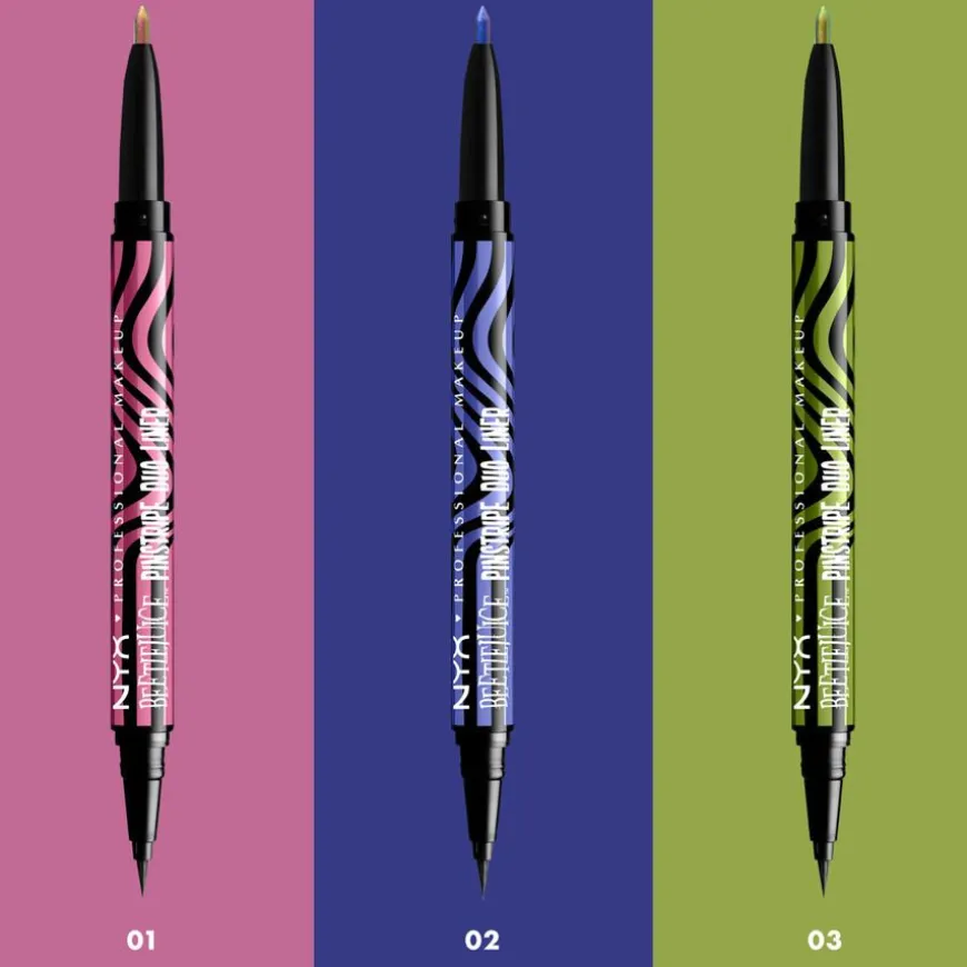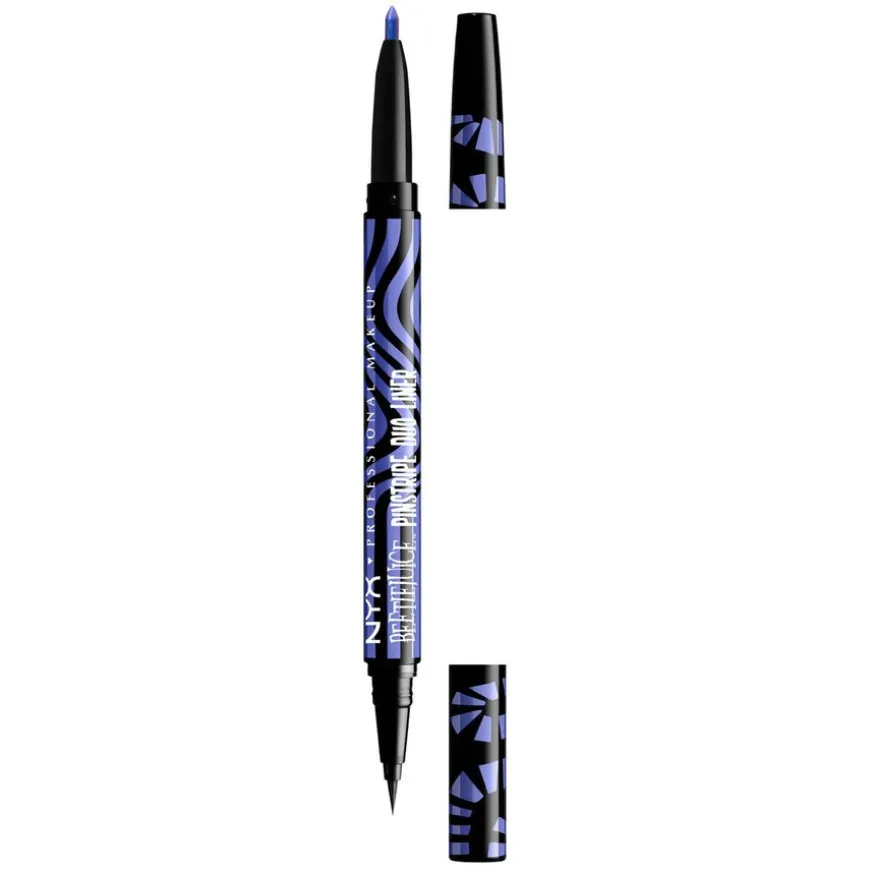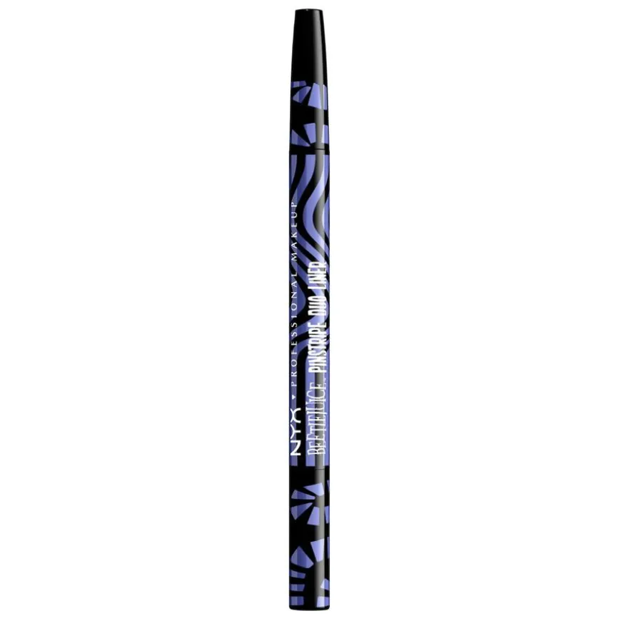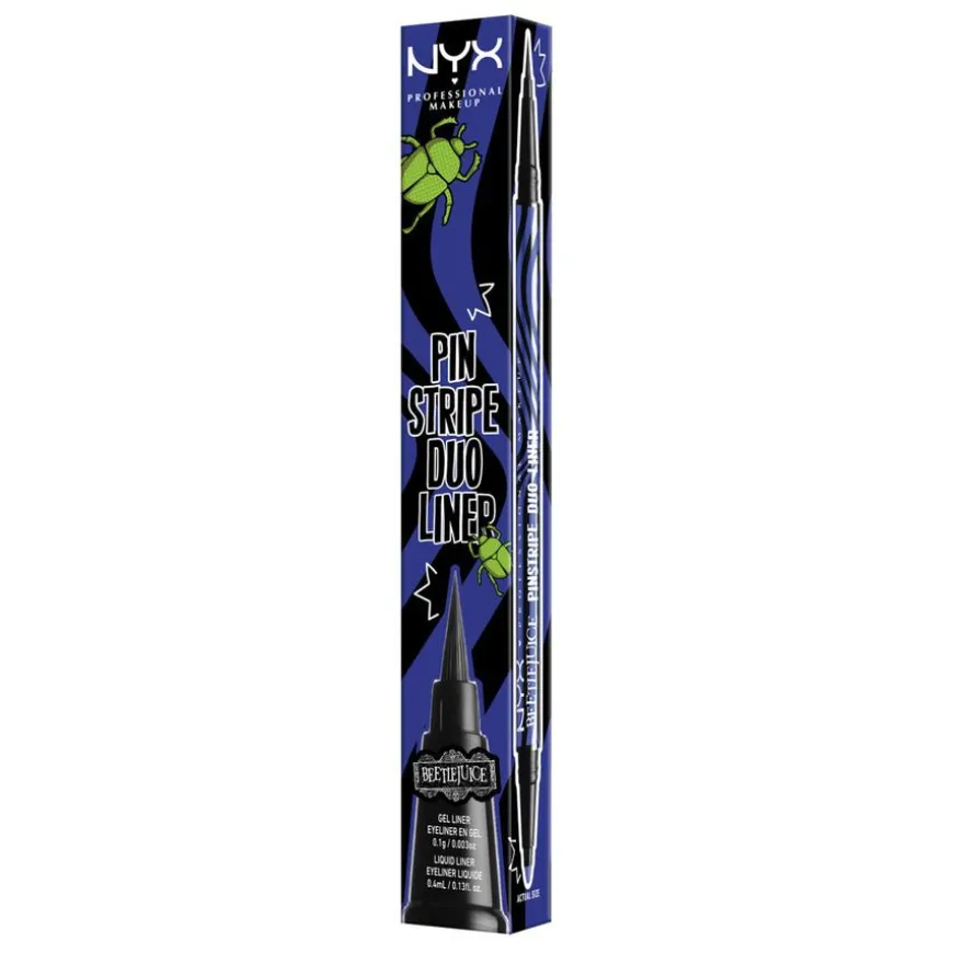 Beetlejuice Pinstripe er en eyeliner der profesjonalitet møter ikonisk farge. Tre ut av venteværelset og inn i det hinsidige med disse transformerende og dødsfine nyansene fra NYX Professional Makeup. Tre nye tosidige eyelinere i sort og krom inspirert av den nye Beetlejuice- filmen. I den ene enden er det en vidunderlig klassisk svart eyeliner med tynn og smidig applikatorspiss, i den andre enden en blyantliner med fyldig kromfarge. Den intenst pigmenterte eyeliner-duoen er perfekt til å tegne flotte, presise linjer. Hver strek du tegner flyter lett for å gi deg full kontroll og en definert finish. Legg litt ekstra press på eyelineren for å få en tykkere strek. Enten du vil ha nesten usynlige linjer eller en klassisk cat-eye look sørger denne vannfaste, flytende eyelineren for episke resultater som holder helt til det hinsidige – og enda litt til.