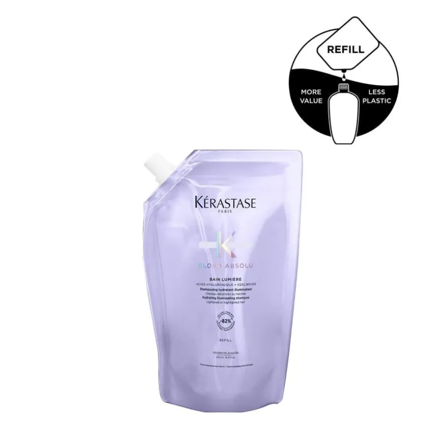 Blond Absolu Bain Lumière Shampoo er en lett shampoo fra Kérastase i refill format og er tilsatt hyaluronsyre og er spesialtilpasset bleket, grått og stipet blondt hår. Denne skånsomt rensende formelen gjør håret glatt og glansfullt fra rot til spiss, gir håret en lett følelse og gjør de blonde tonene klarere. Den renser håret for forurensende stoffer som kan gjøre at håret virker livløst. Formelen er beriket med en effektiv kombinasjon av hyaluronsyre og edelweissblomst, og har en høy konsentrasjon av antioksidanter som hindrer at håret brekker og beskytter fibrene. Hyaluronsyre fukter blondt hår og gjør hvert hårstrå glattere. Håret gjøres klart for pleie med en strålende glans. Refill påsen kan kun brukes sammen med Kérastase sin 500ml shampooflaske.