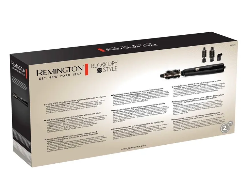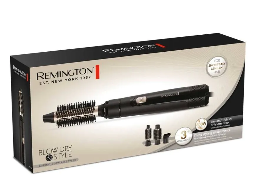 Remington Blow Dry & Style – Caring 800W Airstyler er en varmluftsbørste tilpasset personer med kort til middels langt hår. Velg mellom 2 varme/hastighetsinnstillinger og kaldluftsfunksjon for å fikse håret.