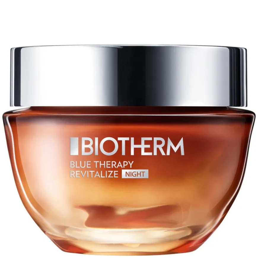 Blue Therapy Amber Algae Revitalize Moisturizing Night er en styrkende og nærende nattkrem til ansikt, hals og decolleté. Denne nattkremen inneholder en unik alge, Amber Algae, samt en blanding av styrkende ingredienser som blant annet Biotherms signaturingrediens Life Plankton™ probiotiske fraksjoner fra naturlig opprinnelse. Nattkremen styrker, fukter og nærer huden gjennom natten. I tillegg oppleves huden med en naturlig glød og huden føles behagelig neste morgen.
