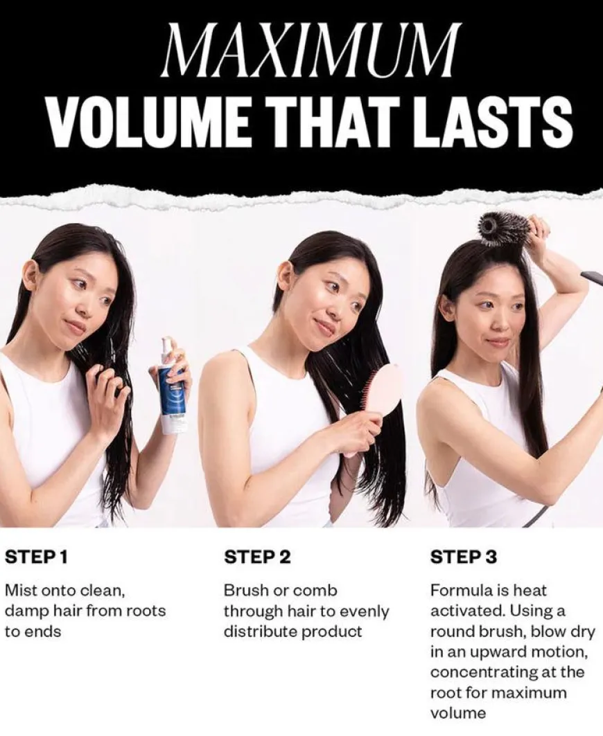 - Spray rikelig fra rot til spiss på rent, fuktig hår.