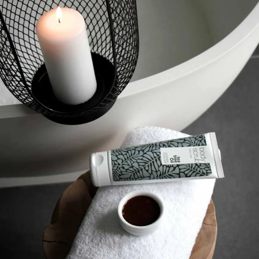 Kroppsskrubben kan med fordel brukes ved appelsinhud, strekkmerker eller andre ujevnheter, så hudens utseende forbedres og den fremstår glatt og sunn med nydelig glød. Den naturlige tetreoljen hjelper mot uren hud, da oljen effektivt motvirker urenheter som kan sette seg på huden og forårsake kviser.