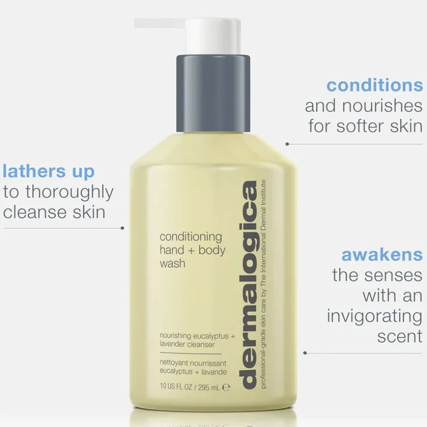 Conditioning Hand & Body Wash er en sensorisk og nærende dusjgele som renser i dybden, samtidig som den pleier huden. Dusjgelen er en del av Dermalogica Body Collection – en serie produkter til kroppspleie som er utviklet for å invitere til øyeblikk med refleksjon og hvile, samtidig som avanserte ingredienser gir resultater på huden. Aromatiske oljer fra fransk rosmarin og kinesisk eukalyptus jobber sammen med friske oljer fra te-tre og sitron som renser huden og vekker sansene, samtidig som pro-vitamin B5 og beroligende sandeltre, lavendel og muskatsalvie mykgjør og nærer. Produktet er vegansk og cruelty-free.