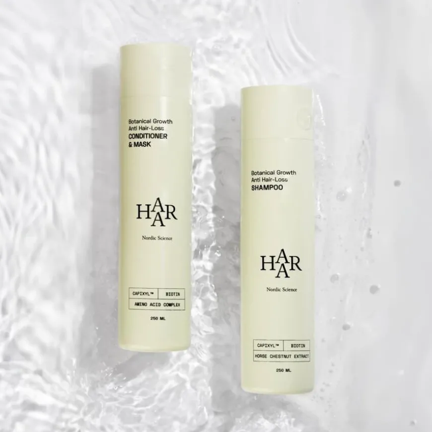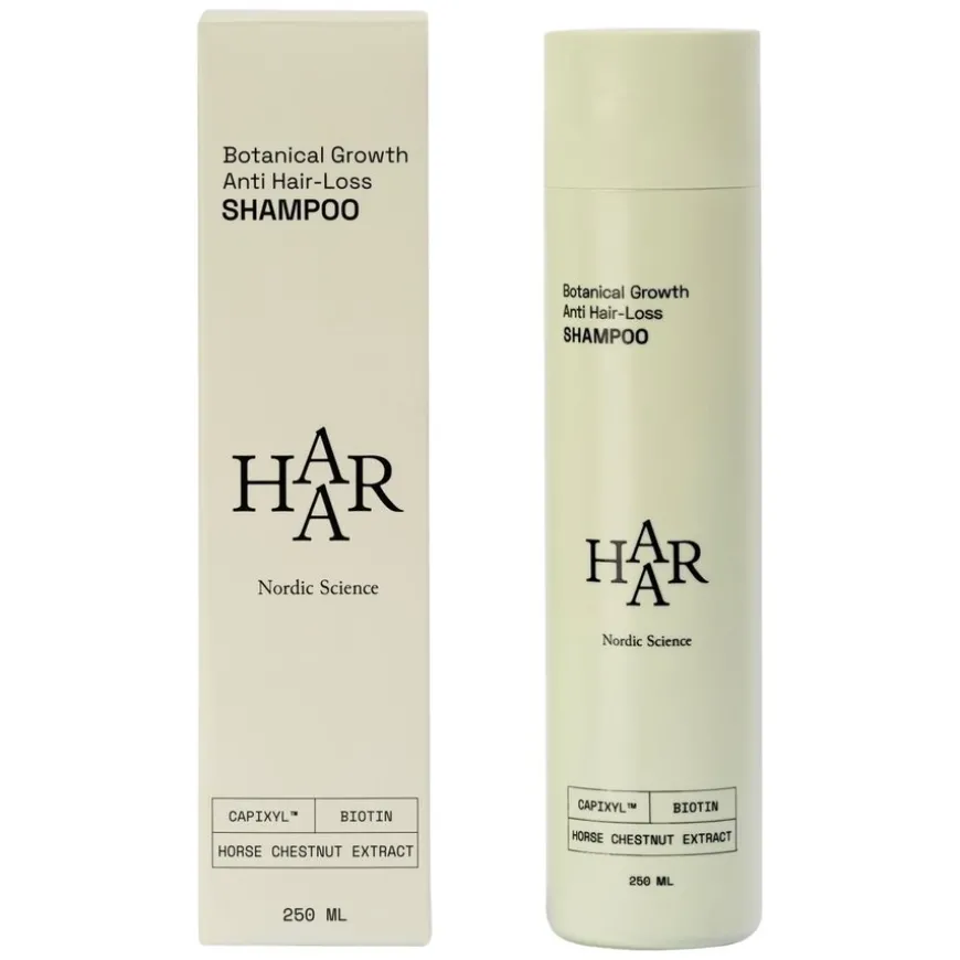 Botanical Growth Anti Hair-Loss Shampoo er utviklet for å skape optimale vekstforhold for håret ved å stimulere hårsekkene, redusere inflammasjon og styrke hodebunnen. Denne veganske og skånsomme shampooen er formulert med Capixyl™, biotin og hestekastanjeekstrakt, som sammen bekjemper hårtap og fremmer en sunn hårvekstsyklus. Capixyl™ kombinerer et biomimetisk signalpeptid (acetyltetrapeptid-3) med rødkløverekstrakt rikt på Biochanin A, som fremmer keratinproduksjon og reaktiverer hårsekker. Biotin (vitamin B7) støtter omdannelsen av aminosyrer til keratin – et byggesteinprotein i hårstrukturen. Hestekastanjeekstrakt tilfører antioksidanter og virker betennelsesdempende, og styrker dermed hodebunnens helse. Produktet har en balansert pH-verdi på 5–5,5 og er egnet for alle hårtyper. Shampooen er fri for silikoner og kunstige fargestoffer, og er et ideelt valg for daglig bruk.