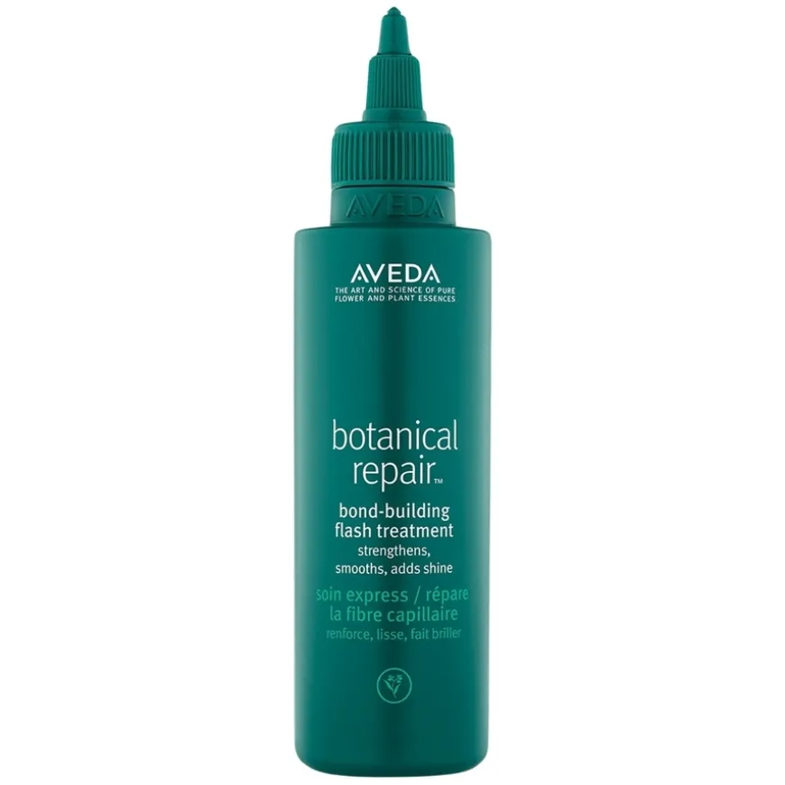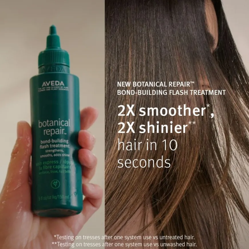 Botanical Repair Bond-Building Flash Treatment fra Aveda gir håret et umiddelbart løft av styrke, 2 ganger mer glans* og 2 ganger mer mykhet** – på bare 10 sekunder. Den lette, skyllbare behandlingen påføres etter Botanical Repair Shampoo og Conditioner og bygger nye bindinger for å styrke håret fra innsiden og ut. Formelen kombinerer Avedas triple-action plantebaserte bond-building-teknologi med vegansk melkesyre som jevner ut skjellaget for en glatt og blank finish, og lamellær flytende krystallteknologi som gir målrettet pleie og glans der det trengs mest. Behandlingen inneholder også en Macro Green Blend med økologisk avokado, sacha inchi og grønn te-frøoljer som nærer og glatter håret, og et beskyttende Bio-Shield Complex med kokos- og maisavledede ingredienser som etterligner hårets naturlige F-lag. Passer alle hårtyper og teksturer (1A–4C) og er trygg for farge- og kjemisk behandlet hår. Produktet er 98 % naturlig fremstilt***, silikonfritt, vegansk og godkjent av Leaping Bunny. Aroma: Frisk, lett blomster- og urteduft med sertifiserte økologiske eteriske oljer av ylang-ylang, rose og merian.