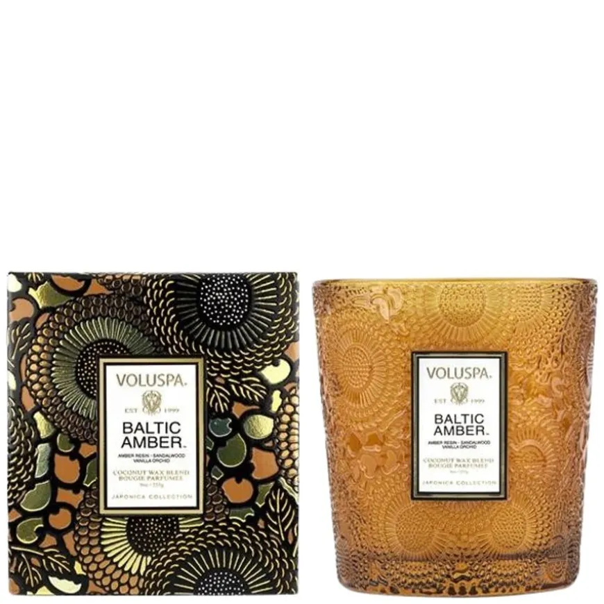 Boxed Candle Baltic Amber er et elegant duftlys fra Voluspa, perfekt for å tilføre hjemmet en varm og avslappende stemning. Duften er rik og sensuell med noter av amber resin, sandeltre, sedertre og vaniljeorkidé – en perfekt balanse mellom dybde og mykhet. Lyset er håndlaget med en eksklusiv kokosnøttvoksblanding og har en naturlig veke som gir en jevn og stabil flamme. Glasset med preget design fungerer som et vakkert dekorobjekt både før og etter bruk, og lyset har en brenntid på opptil 60 timer.