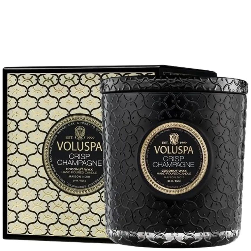 Maison Luxe Candle Crisp Champagne har en luksuriøs og festlig duft av glitrende champagne, med myke innslag av vanilje og eikefat. Lyset kommer i et vakkert preget svart glass og presenteres i en matchende gaveeske – perfekt som gave eller dekorasjon i hjemmet.
