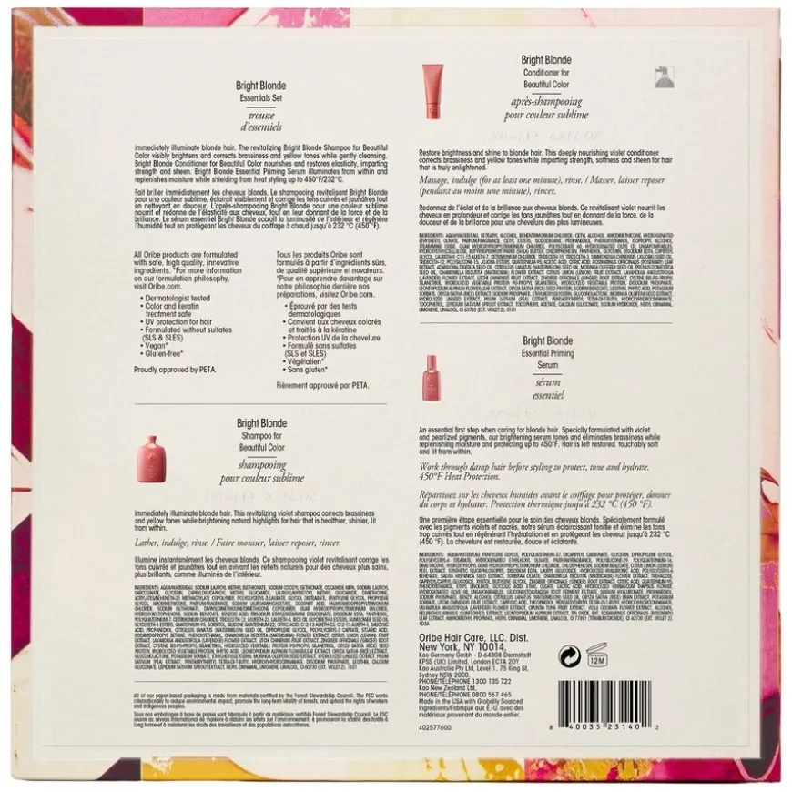 Bright Blonde Shampoo: Aqua/Water/Eau, Sodium Lauroyl Methyl Isethionate, Sodium Cocoyl Isethionate, Sodium Lauroyl Sarcosinate, Cocamide MIPA, Glycerin, Capryloyl/Caproyl Methyl Glucamide, Lauroyl/Myristoyl Methyl Glucamide, Dimethicone, Acrylates/Beheneth-25 Methacrylate Copolymer, Polyglyceryl-3 Caprate, Glycol Distearate, Pentylene Glycol, Propylene Glycol, Parfum/Fragrance, Sodium Lauroamphoacetate, Palmitamidopropyltrimonium Chloride, Amodimethicone, Coconut Acid, Divinyldimethicone/Dimethicone Copolymer, Sodium Isethionate, Guar Hydroxypropyltrimonium Chloride, Hydroxyacetophenone, Benzoic Acid, Sodium Benzoate, Trisodium Ethylenediamine Disuccinate, Disodium EDTA, Panthenol, Polyquaternium-7, Laureth-23, Laureth-4, Cetrimonium Chloride, Trideceth-15, Trideceth-3, Rice Oil Glycereth-8 Esters, Sunflower Seed Oil Glycereth-8 Esters, Quaternium-95, Sorbitol, Silicone Quaternium-22, Phenoxyethanol, Citric Acid, C12-13 Pareth-23, C12-13 Pareth-3, Salicylic Acid, Propanediol, Dipropylene Glycol, Butylene Glycol, Stearic Acid, Cocamidopropyl Betaine, Alcohol, Chamomilla Recutita (Matricaria) Flower Extract, Acetic Acid, Citrus Limon (Lemon) Fruit Extract, Lavandula Angustifolia (Lavender) Flower Extract, Zingiber Officinale (Ginger) Root Extract, Cystine Bis-PG-Propyl Silanetriol, Hydrolyzed Vegetable Protein PG-Propyl Silanetriol, Oryza Sativa (Rice) Seed Protein, Hydrolyzed Vegetable Protein, Phytic Acid, Leontopodium Alpinum Extract, Oryza Sativa (Rice) Extract, Amber Extract, Citrullus Lanatus (Watermelon) Fruit Extract, Gluconolactone, Potassium Sorbate, Citrulline, Ethylhexylglycerin, Rhodiola Rosea Root Extract, Caesalpinia Spinosa Gum, Litchi Chinensis Pericarp Extract, Moringa Oleifera Seed Extract, Pentaerythrityl Tetra-Di-T-Butyl Hydroxyhydrocinnamate, Hydrolyzed Linseed Extract, Pisum Sativum (Pea) Extract, Disodium Phosphate, Lecithin, Calcium Gluconate, Benzyl Alcohol, Lepidium Sativum Sprout Extract, Limonene, Hexyl Cinnamal, Linalool, CI 60730 (Ext. Violet 2).; Bright Blonde Conditioner: Aqua/Water/Eau, Cetearyl Alcohol, Behentrimonium Chloride, Cetyl Alcohol, Amodimethicone, Hydrogenated Ethylhexyl Olivate, Parfum/Fragrance, Cetyl Esters, Isododecane, Phenoxyethanol, Propanediol, Stearamine Oxide, Guar Hydroxypropyltrimonium Chloride, Isopropyl Alcohol, Polysorbate 60, Hydrogenated Olive Oil Unsaponifiables, Hydroxyethylcellulose, Butyrospermum Parkii (Shea) Butter, Chlorphenesin, Panthenol, Glycerin, Disodium EDTA, C11-15 Pareth-7, Caprylyl Glycol, Laureth-9, Cetrimonium Chloride, Trideceth-15, Trideceth-3, Trideceth-12, BHT, Polysilicone-15, Jojoba Esters, Quaternium-95, Acetic Acid, Citric Acid, Adansonia Digitata Seed Oil, Helianthus Annuus (Sunflower) Seed Oil, Prunus Insititia Seed Oil, Moringa Oleifera Seed Oil, Butylene Glycol, Alcohol, Chamomilla Recutita (Matricaria) Flower Extract, Citrus Limon (Lemon) Fruit Extract, Lavandula Angustifolia (Lavender) Flower Extract, Zingiber Officinale (Ginger) Root Extract, Cystine Bis-PG-Propyl Silanetriol, Hydrolyzed Vegetable Protein PG-Propyl Silanetriol, Hydrolyzed Vegetable Protein, Leontopodium Alpinum Extract, Disodium Phosphate, Amber Extract, Citrullus Lanatus (Watermelon) Fruit Extract, Sodium Benzoate, Potassium Sorbate, Oryza Sativa (Rice) Seed Protein, Lecithin, Phytic Acid, Oryza Sativa (Rice) Extract, Sodium Phosphate, Citrulline, Ethylhexylglycerin, Gluconolactone, Rhodiola Rosea Root Extract, Caesalpinia Spinosa Gum, Litchi Chinensis Pericarp Extract, Moringa Oleifera Seed Extract, Tocopheryl Acetate, Hydrolyzed Linseed Extract, Pisum Sativum (Pea) Extract, Pentaerythrityl Tetra-Di-T-Butyl Hydroxyhydrocinnamate, Tocopherol, Lepidium Sativum Sprout Extract, Calcium Gluconate, Limonene, Hexyl Cinnamal, Linalool, CI 60730 (Ext. Violet 2).; Bright Blonde Priming Serum: Aqua/Water/Eau, Pentylene Glycol, Polyquaternium-37, Dicaprylyl Carbonate, Glycerin, Dipropylene Glycol, Polyglyceryl-6 Stearate, Hydrogenated Ethylhexyl Olivate, Parfum/Fragrance, Polysilicone-29, Polyquaternium-16, Dimethicone, Hydroxypropyl Guar Hydroxypropyltrimonium Chloride, Chlorphenesin, Sodium Benzoate, Citrus Limon (Lemon) Peel Extract, Synthetic Fluorphlogopite, Disodium EDTA, Lauryl Glucoside, Hydrolyzed Hyaluronic Acid, Polyglyceryl-6 Behenate, Salvia Hispanica Seed Extract, Sorbitan Oleate, Chamomilla Recutita (Matricaria) Flower Extract, Trehalose, Caprylyl/Capryl Glucoside, Xylitol, Butylene Glycol, Zingiber Officinale (Ginger) Root Extract, Citric Acid, Quaternium-95, Phenoxyethanol, Ethyl Linoleate, Glycolic Acid, Ethyl Oleate, Lactic Acid, Hydrolyzed Verbascum Thapsus Flower, Hydrogenated Olive Oil Unsaponifiables, Leuconostoc/Radish Root Ferment Filtrate, Sodium Hyaluronate, Propanediol, Sodium Phosphate, Benzyl Alcohol, Citrullus Lanatus (Watermelon) Seed Oil, Oryza Sativa (Rice) Bran Extract, Potassium Sorbate, Litchi Chinensis Fruit Extract, Caprylic Acid, Tocopherol, Pentaerythrityl Tetra-Di-T-Butyl Hydroxyhydrocinnamate, Lavandula Angustifolia (Lavender) Flower Extract, Opuntia Tuna Fruit Extract, Viola Odorata Flower Extract, Alcohol, Helianthus Annuus (Sunflower) Extract, Leontopodium Alpinum Extract, Tin Oxide, BHT, Rosmarinus Officinalis (Rosemary) Leaf Extract, Aminomethyl Propanol, Hexyl Cinnamal, Limonene, Linalool, CI 77891 (Titanium Dioxide), CI 60730 (Ext. Violet 2).