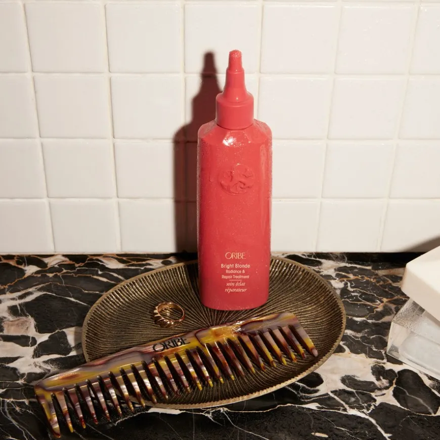 Bright Blonde Radiance & Repair Treatment er et konsentrat for blondt hår.Behold fargen klar med Oribes resturerende silkebehandling som er spesielt utviklet for blondiner. Dette superladede konsentratet toner øyeblikkelig håret med fiolette pigmenter for å minske de varme pigmentene og gjør håret klarere. Det er formulert med en blanding av rike oljer og lavendelekstrakt, og etterlater håret reparert, næret og ultramykt.