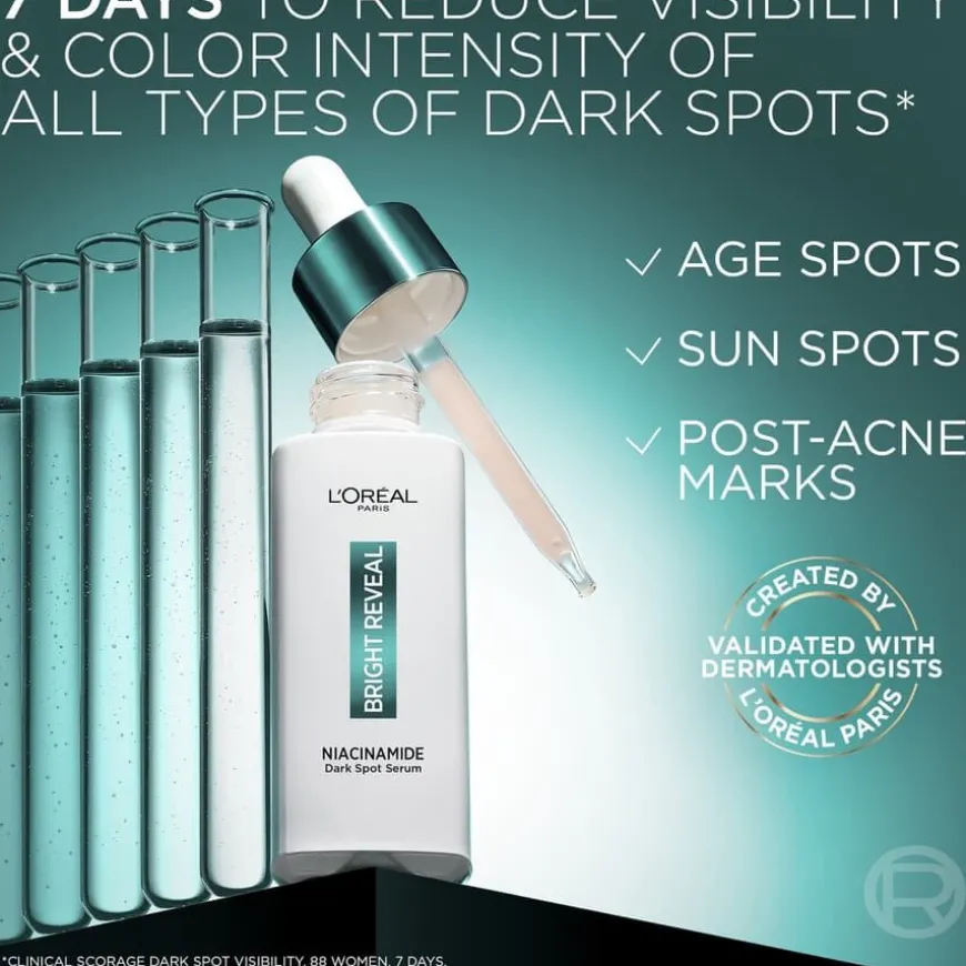 Bright Reveal Niacinamide Dark Spot Serum er et serum som reduserer synlig alle typer mørke flekker. Formelen inneholder en effektiv blanding av aktive ingredienser for å redusere synligheten av mørke flekker: serum med 7,5% niacinamid + 2,5% Amino-Sulfonic Acid i en behagelig konsistens som ikke føles klissete på huden.