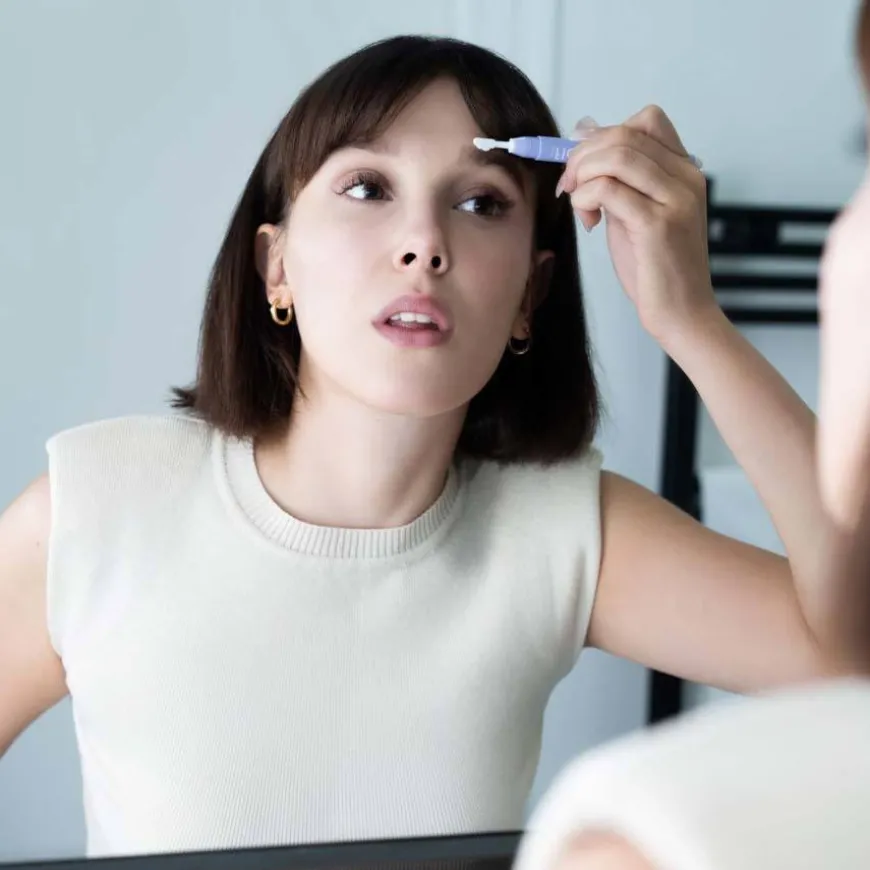 - Påfør øyenbrynsvoksen i korte strøk frem og tilbake over hele øyenbrynet.