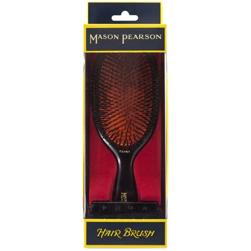 En stor, skikkelig myk og smidig hårbørste! Denne børsten rengjør håret, stimulerer hodebunnen og øker blodomløpet til røttene for å spre hodebunnens naturlige, pleiende olje til hårets lengder og gi styrke, smidighet og en sunn glød. Denne hårbørsten har et håndtak av cellulose-plast som er håndpolert for å være så komfortabel som mulig. Den unike gummiputen, laget for hånd med Mason Pearsons opprinnelige teknikker, muliggjør effektiv børstning. Den er skånsom å bruke og masserer hodebunnen.