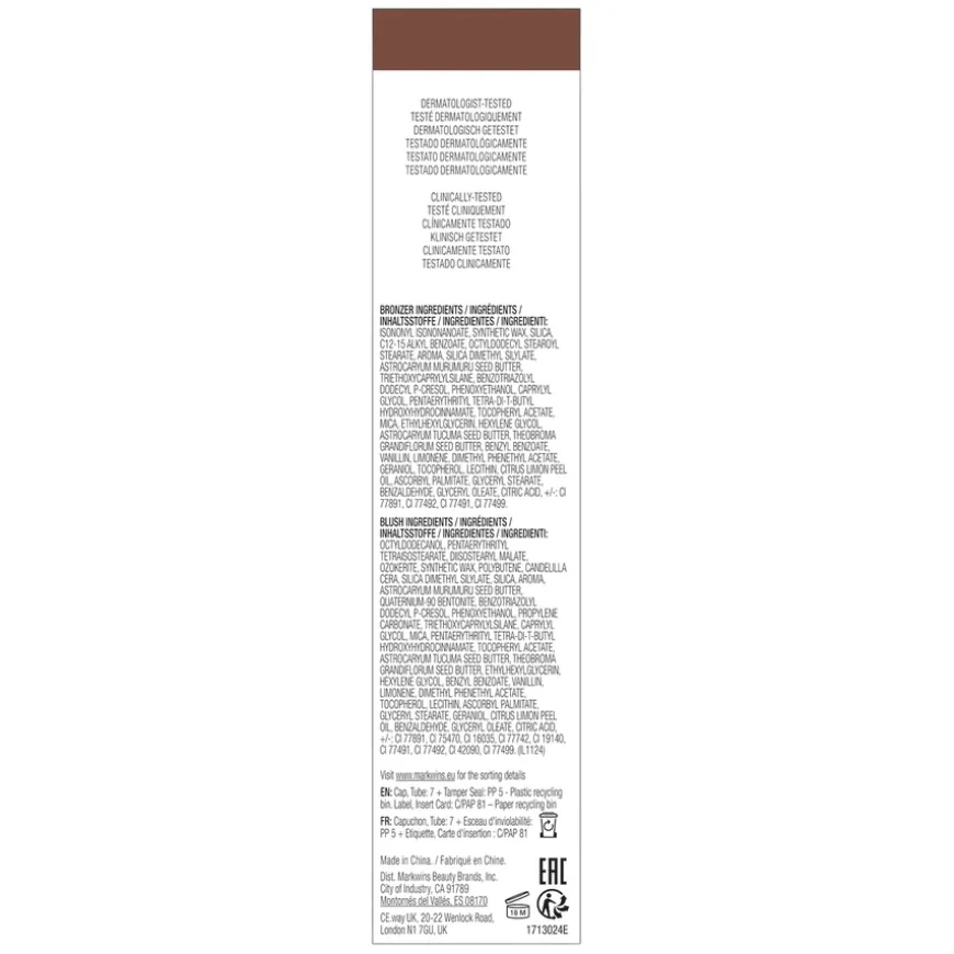Bronzer INGREDIENTS: Isononyl Isononanoate, Synthetic Wax, Silica, C12-15 Alkyl Benzoate, Octyldodecyl Stearoyl Stearate, Aroma, Silica Dimethyl Silylate, Astrocaryum Murumuru Seed Butter, Triethoxycaprylylsilane, Benzotriazolyl Dodecyl p-Cresol, Phenoxyethanol, Caprylyl Glycol, Pentaerythrityl Tetra-di-t-butyl Hydroxyhydrocinnamate, Tocopheryl Acetate, Mica, Ethylhexylglycerin, Hexylene Glycol, Astrocaryum Tucuma Seed Butter, Theobroma Grandiflorum Seed Butter, Benzyl Benzoate, Vanillin, Limonene, Dimethyl Phenethyl Acetate, Geraniol, Tocopherol, Lecithin, Citrus Limon Peel Oil, Ascorbyl Palmitate, Glyceryl Stearate, Benzaldehyde, Glyceryl Oleate, Citric Acid, +/-: CI 77891, CI 77492, CI 77491, CI 77499. Blush INGREDIENTS: Octyldodecanol, Pentaerythrityl Tetraisostearate, Diisostearyl Malate, Ozokerite, Synthetic Wax, Polybutene, Candelilla Cera, Silica Dimethyl Silylate, Silica, Aroma, Astrocaryum Murumuru Seed Butter, Quaternium-90 Bentonite, Benzotriazolyl Dodecyl p-Cresol, Phenoxyethanol, Propylene Carbonate, Triethoxycaprylylsilane, Caprylyl Glycol, Mica, Pentaerythrityl Tetra-di-t-butyl Hydroxyhydrocinnamate, Tocopheryl Acetate, Astrocaryum Tucuma Seed Butter, Theobroma Grandiflorum Seed Butter, Ethylhexylglycerin, Hexylene Glycol, Benzyl Benzoate, Vanillin, Limonene, Dimethyl Phenethyl Acetate, Tocopherol, Lecithin, Ascorbyl Palmitate, Glyceryl Stearate, Geraniol, Citrus Limon Peel Oil, Benzaldehyde, Glyceryl Oleate, Citric Acid, +/-: CI 77891, CI 75470, CI 16035, CI 77742, CI 19140, CI 77491, CI 77492, CI 42090, CI 77499. (IL1124)