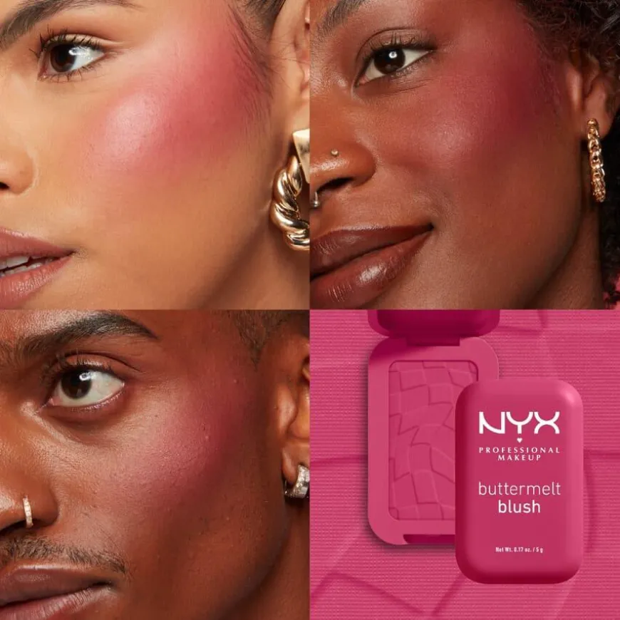 Buttermelt Blush fra NYX Professional Makeup er full av vakre pigmenter som er enkle å tone ut og som holder lenge. Den kremede formelen er full av vakre pigmenter som er enkle å tone ut. Beriket med mango-, mandel- og sheasmør – går alt som smurt. Brukes sammen med Buttermelt Blush Brush for perfekt påføring. Skap den looken du liker best, med alt fra sarte rosa nyanser, til fersken og fuksia. Velg mellom nyanser som enten går ton i ton med huden eller ekstra skimmer. Egnet for alle hudtyper.