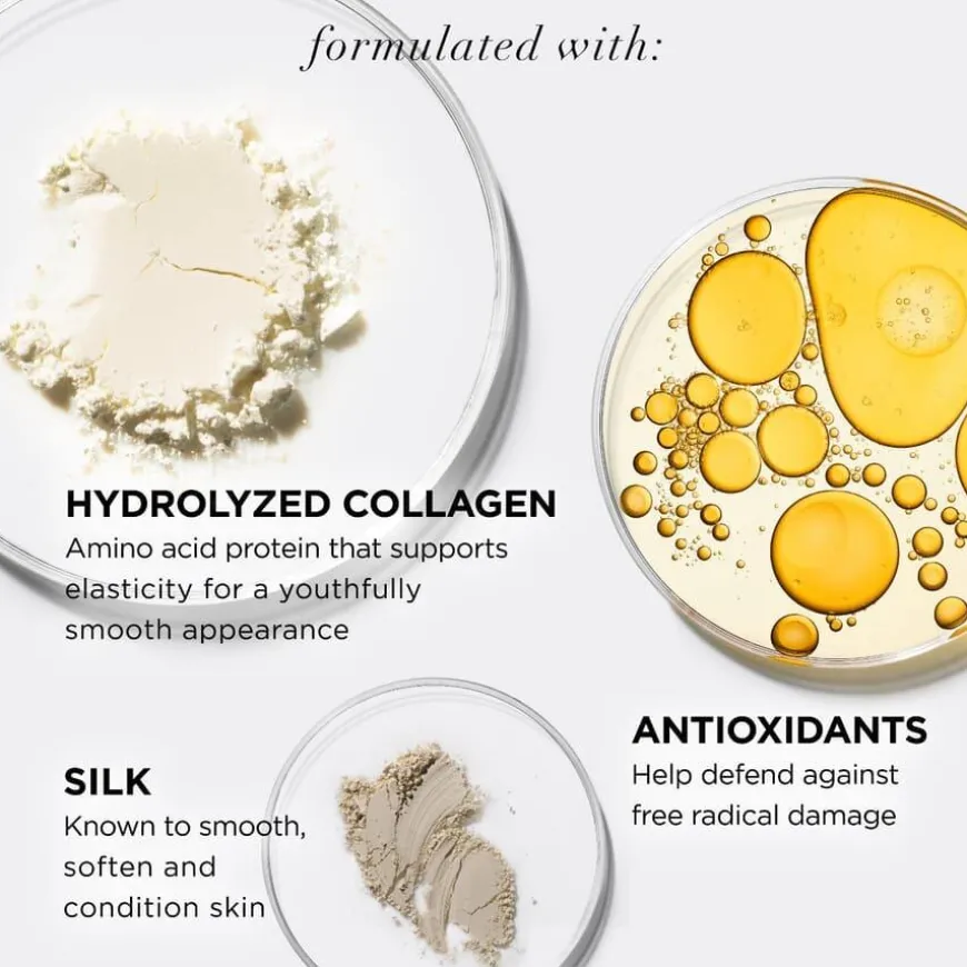 - Inneholder kollagen som strammer opp og glatter ut huden.