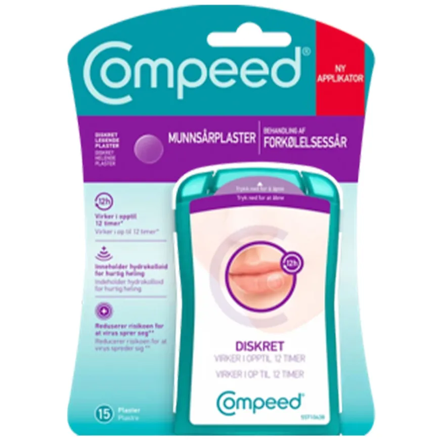 Compeed C-Sore Healing Patches er usynlige munnsårplaster til forkjølelsessår som gir omgående lindring ved å dempe svie og kløe og hindrer skorpedannelse. Ultratynt transparent plaster som beskytter området samtidig som det reduserer risikoen for eventuell smittespredning ved kontakt. Plasteret inneholder ingen aktive ingredienser, men bygger på hydrokolloidprinsippet, altså fuktig sårbehandling. Nanocolloid-075 er mye tynnere enn de andre Compeed plastrene, absorberer mindre fuktighet og slipper ut mer fuktighet. Forkjølelsessåret heles derfor på en annen måte selv om prinsippet er det samme. De andre Compeed produktene er tykkere, tettere og har en høyere absorbasjonsevne enn plaster til forkjølelsessår. Produktene skal derfor ikke brukes om hverandre. inneholder aktiv hydrokolloidgelé-teknologi som bidrar til rask leging og hindrer skorpedannelse. Den diskré utformingen bidrar til å beskytte munnsåret, hindrer videre smitte og kan sminkes over. Plasteret skaper også et virusskjold som reduserer risikoen for smitte.