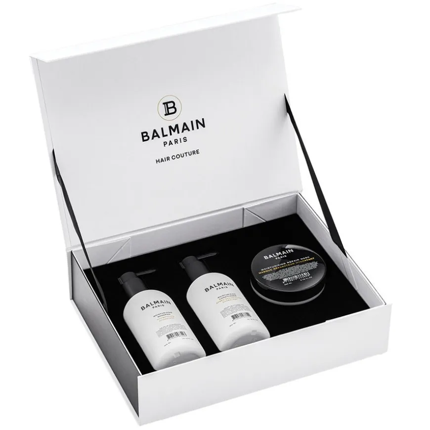 Balmain Care & Style Moisturizing Care Set er en komplett hårpleieløsning som inkluderer en intensiv Moisturizing Repair Mask for reparasjon, fuktighet og glans, samt en dypt nærende Moisturizing Shampoo og Conditioner for å oppnå glatt, sterkt og håndterbart hår. Dette settet gir omfattende pleie for naturlig eller fargebehandlet hår.