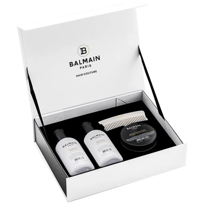 Balmain Care & Style Revitalizing Care Set er en komplett hårpleieløsning for tørt og skadet hår, inkludert en fuktighetsgivende mask, nærende shampoo, og lett balsam. Settet gir vitalitet, styrke, og naturlig glans, med en ekstra stylingkam for enkel hårfiksing.