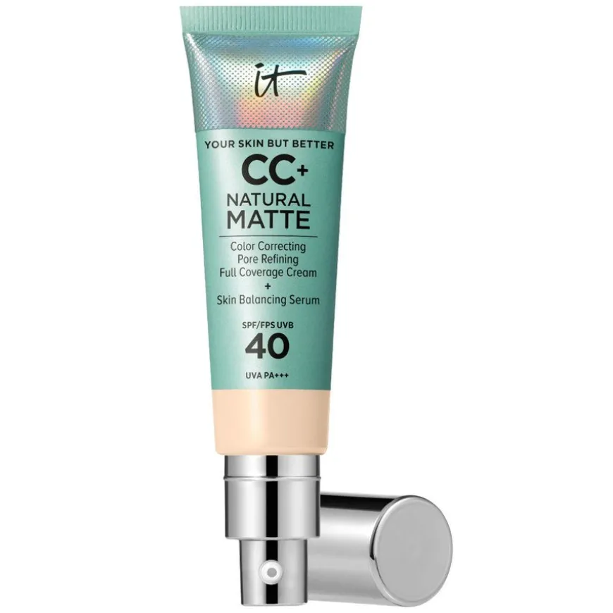 CC+ Cream Natural Matte Foundation er en foundation som gir en synlig matt hud, full dekning og som reduserer blank hud. Kombinert med balanserende serum med SPF40 i samme produkt. Få kontroll over blank hud med en fuktighetsgivende matt foundation med full dekning, og som ikke etterlater huden din tørr eller med et flatt uttrykk. It Cosmetics sin matte CC cream forfiner porene og gir et naturlig matt (aldri flatt) resultat. Kremen skjuler synlig ujevn hudtone, rødhet i ansiktet og urenheter, samtidig som den tilfører huden fuktighet til fet og kombinert gjennom hele dagen.