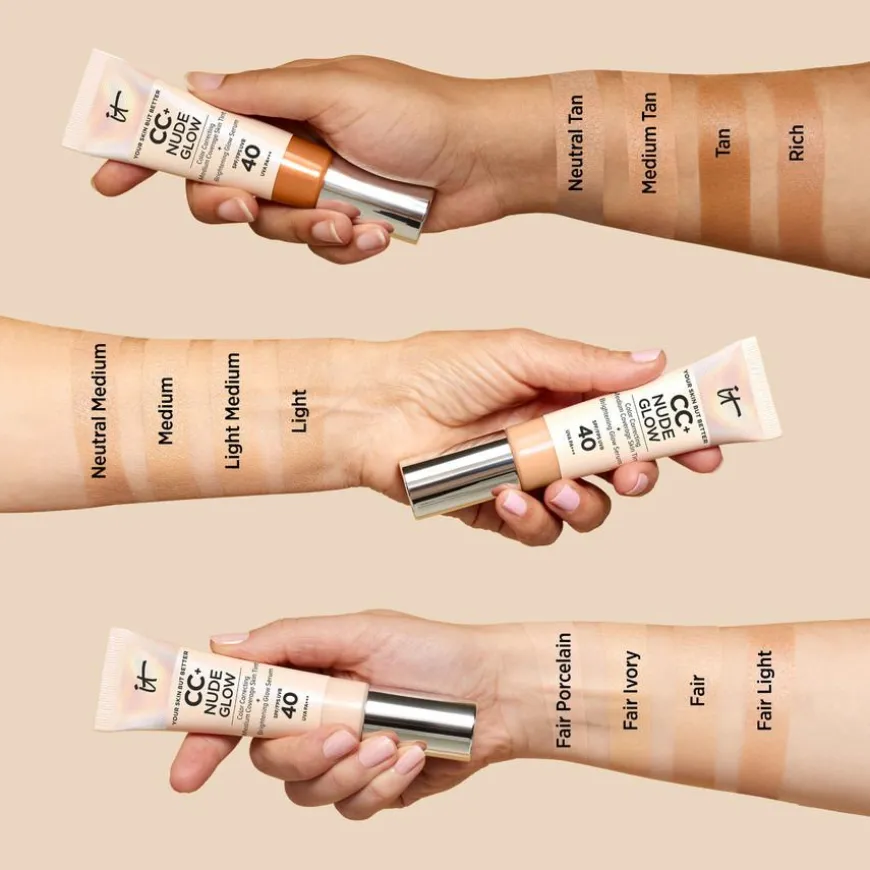 It Cosmetics CC+ Nude Glow SPF 40 er en lett, middels dekkende krem som gir en sunn glød i nude-nyanser. Få glød med klarere, fuktet hud umiddelbart og over tid.Den patentansøkte formelen inneholder 90% hudpleie og er beriket med et Brightening Glow Serum med 2% niacinamid, hyaluronsyre og ekstrakt av grønn te. På bare 4 uker vil produktet bidra til synlig klarere hud, forbedret hudtekstur, mykere hud og en jevnere hudtone. I tillegg gir den deg 24 timer fuktet hud, for en umiddelbar sunn glød og et makeupfritt utseende.