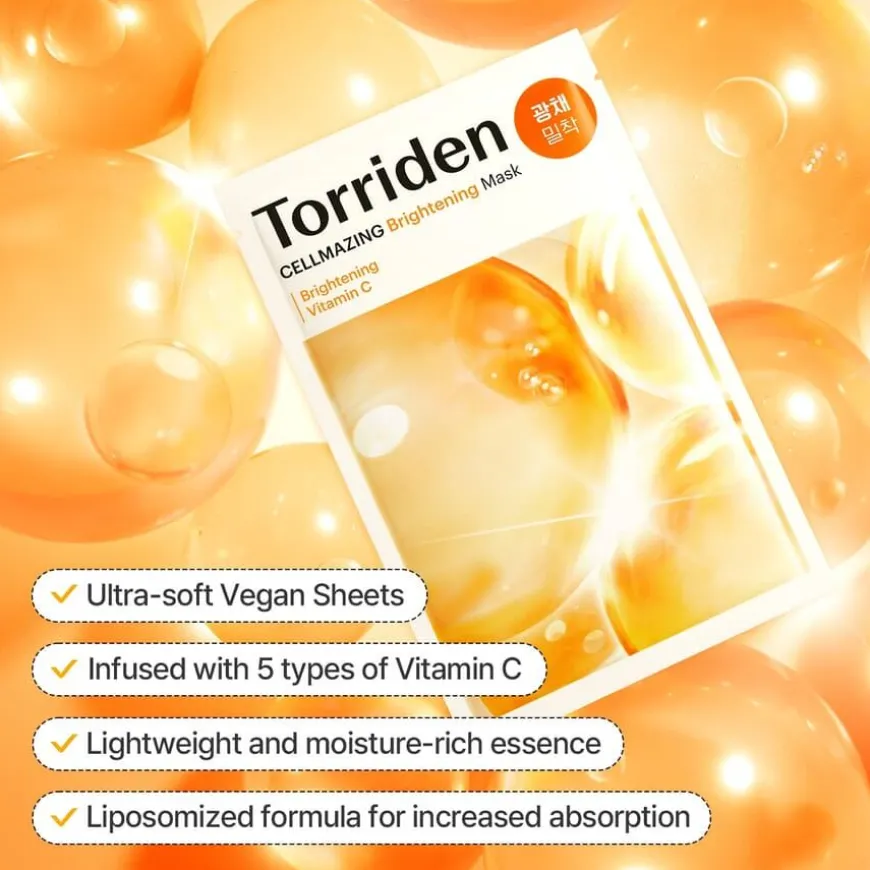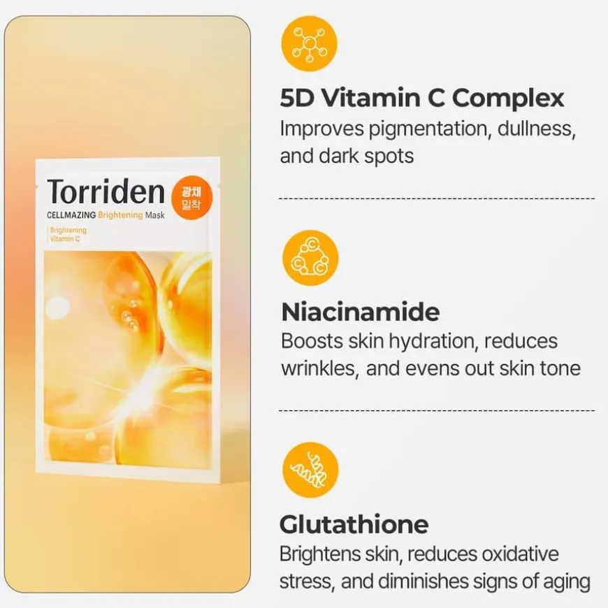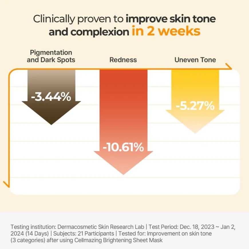 CELLMAZING Brightening Mask er en kraftfull lysnende og fuktighetsgivende behandling beriket med stabilisert vitamin C, fire avanserte vitamin C-derivater, glutation, panthenol og allantoin. Denne virkningsfulle sammensetningen av ingredienser forsterker hudens fuktighetsnivåer og gir en umiddelbar, strålende glød.
