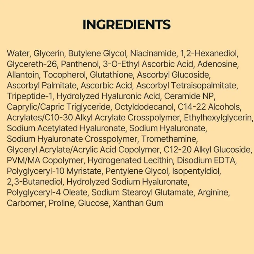 Aqua, Glycerin, Butylene Glycol, Niacinamide, 1,2-Hexanediol, Glycereth-26, Panthenol, Caprylic/Capric Triglyceride, Octyldodecanol, C14-22 Alcohols, Acrylates/C10-30 Alkyl Acrylate Crosspolymer, Ethylhexylglycerin, 3-O-Ethyl Ascorbic Acid, Tromethamine, Glyceryl Acrylate/Acrylic Acid Copolymer, Adenosine, C12-20 Alkyl Glucoside, PVM/MA Copolymer, Allantoin, Disodium EDTA, Hydrogenated Lecithin, Xanthan Gum, Polyglyceryl-10 Myristate, Glutathione, Hydrolyzed Hyaluronic Acid, Ceramide NP, Pentylene Glycol, Tocopherol, Sodium Acetylated Hyaluronate, Sodium Hyaluronate, Tripeptide-1, Glucose, Sodium Hyaluronate Crosspolymer, Isopentyldiol, 2,3-Butanediol, Hydrolyzed Sodium Hyaluronate, Arginine, Carbomer, Proline, Polyglyceryl-4 Oleate, Sodium Stearoyl Glutamate, Ascorbic Acid, Ascorbyl Glucoside, Ascorbyl Palmitate, Ascorbyl Tetraisopalmitate