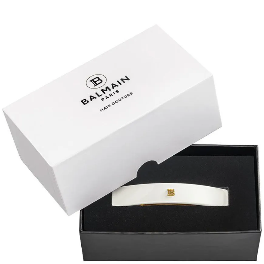 Cellulose Acetate Barrette Pour Cheveux Medium Hairclip er en middels stor hårspennelaget av slitesterk celluloseacetat, designet med Balmains signatur 14K gullbelagt «B» -logo. Det ekstremt sterke, men fleksible materialet er allergivennlig og skånsomt for hår og hodebunn. Hårtilbehøret har et ekte fransk klipp av høy kvalitet under fatet for å sikre perfekt grep om håret og kan brukes for å holde håret tilbake fra ansiktet, pryde en hestehale eller forsterke en up-do.