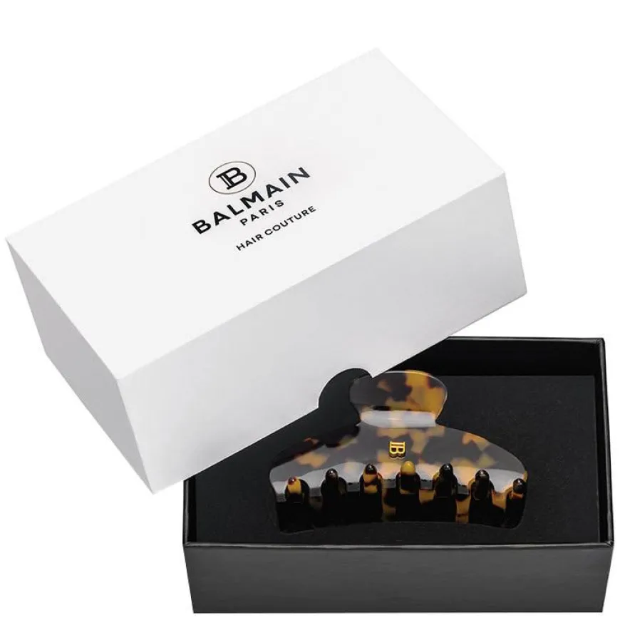 Cellulose Acetate Pince À Cheveux Medium Hairclip er en mellomstor håndlaget klo-klips laget av slitesterk celluloseacetat designet med Balmains signatur 18K gullbelagte «B» -logo. Det ekstremt sterke, men fleksible materialet er allergivennlig og skånsomt for hår og hodebunn. Middels størrelse er svært allsidig for et bredt spekter av frisyrer og perfekt for en rotete bolle, fransk vri eller halv updo.