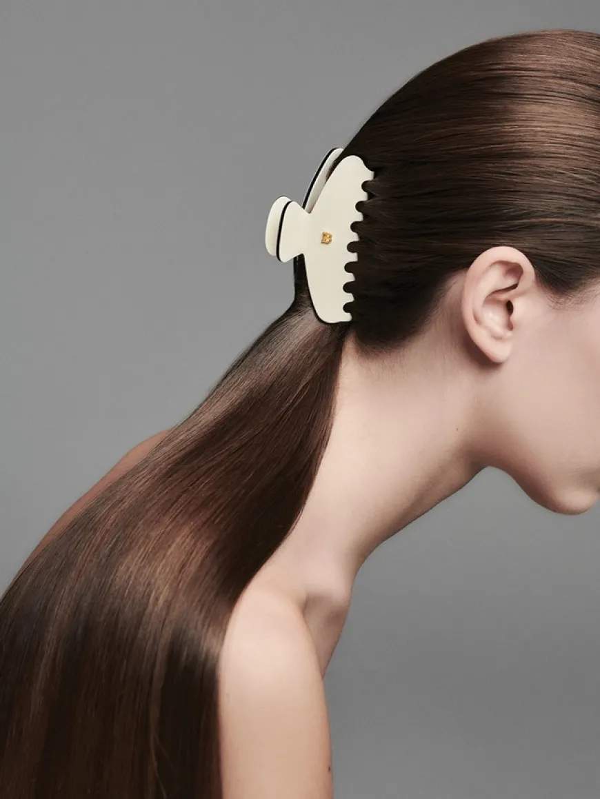 Cellulose Acetate Pince À Cheveux Medium Hairclip er en mellomstor håndlaget klo-klips laget av slitesterk celluloseacetat designet med Balmains signatur 18K gullbelagte «B» -logo. Det ekstremt sterke, men fleksible materialet er allergivennlig og skånsomt for hår og hodebunn. Middels størrelse er svært allsidig for et bredt spekter av frisyrer og perfekt for en rotete bolle, fransk vri eller halv updo.