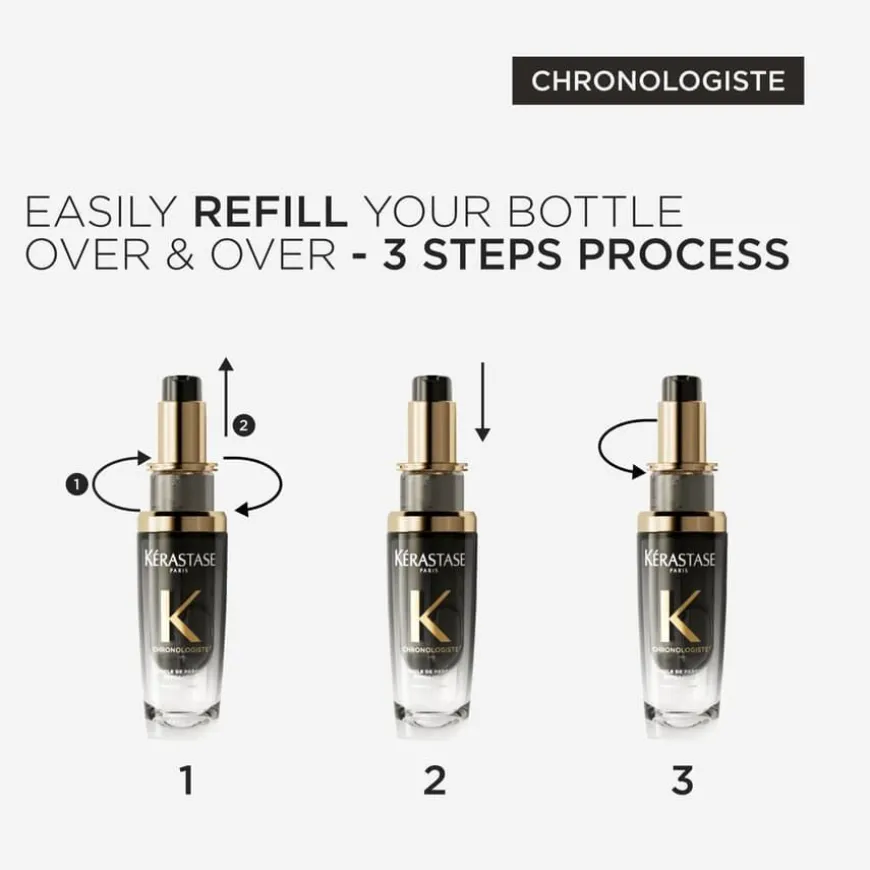 Chronologiste L’Huile De Parfum Refillable Hair Oil fra Kérastase er en etterfyllbar hårolje med en utsøkt duftopplevelse for håret. Denne håroljen leverer overlegen ytelse og en revitaliserende og pleiende følelse. Oljen gir håret en intens duft med langvarig effekt samtidig som den nærer hårfibrene og gir en strålende finish. Bidrar til å styrke håret og forhindre knekte hårstrå. Denne duftoljen er som en parfyme for håret ditt, laget med en unik kombinasjon av edle noter fra duftverdenen – te-Rose, lyst Tre og musk. Den er beriket med myrraekstrakt, en sjelden og symbolsk duftnote med fornyende egenskaper. Oljen er nå etterfyllbar og kommer i to deler: en flaske laget av 30 % resirkulert glass og en refill laget av 95 % resirkulert plast.