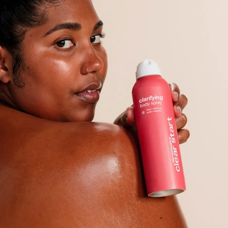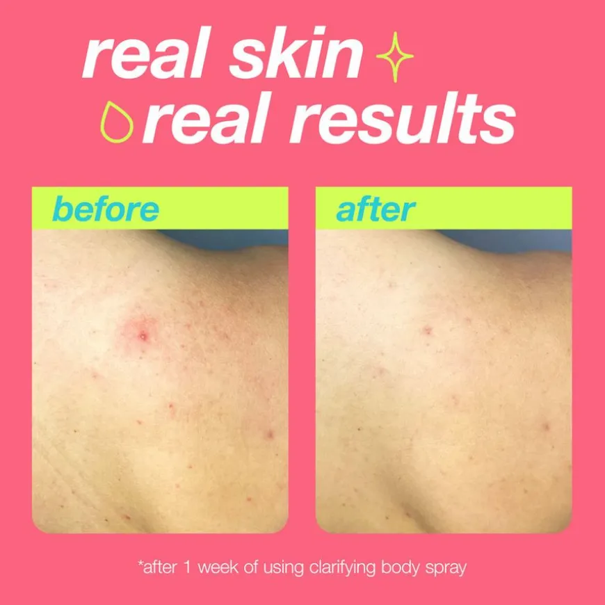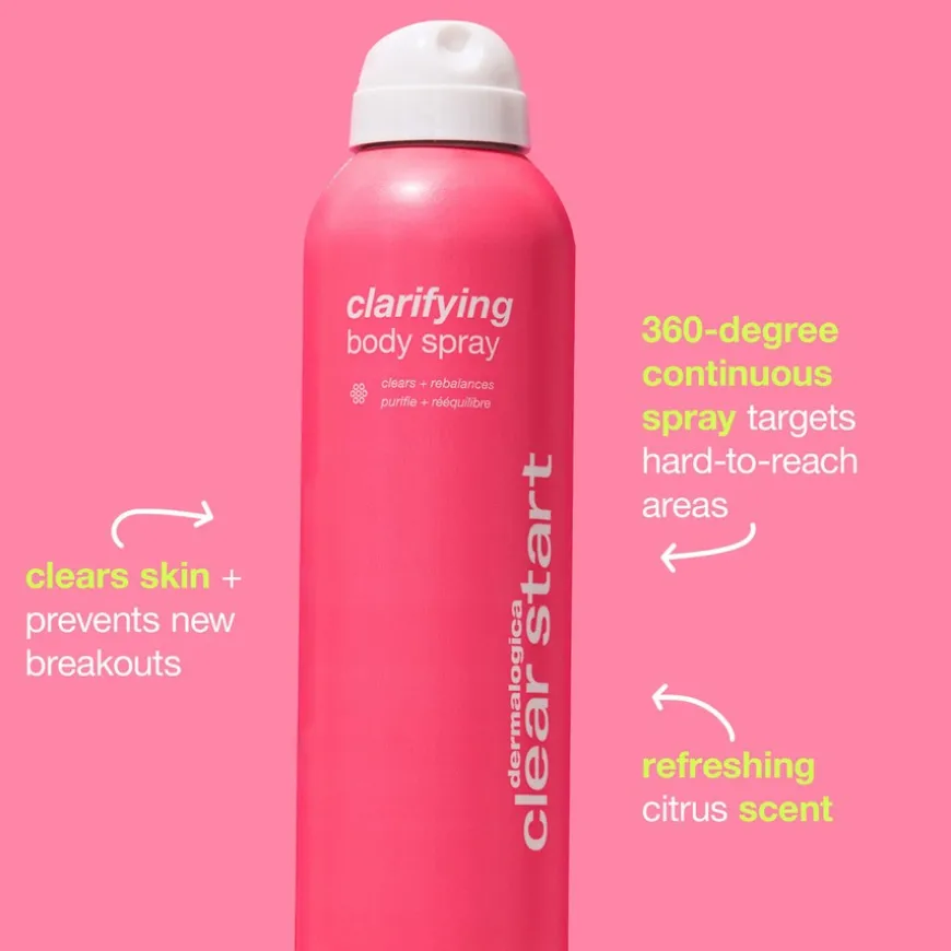 Clarifying Body Spray er en utbruddsbekjempende kroppsspray som fungerer raskt på vanskelig tilgjengelige områder, for å hjelpe til med å fjerne tilstoppede porer og minimere fremtidige kviser på kroppen. Den mikrofine, forfriskende misten fungerer selv når den snus opp ned for å sikre at ingen områder er utenfor rekkevidde. Eksfolierende salisylsyre hjelper til med å fjerne døde hudceller, mens den beroliger trollhassel, tea tree-olje og marokkansk arganekstrakt balanserer talgproduksjonen og reduserer rødhet. Ideell for bruk etter badet, etter trening eller til og med på farten.