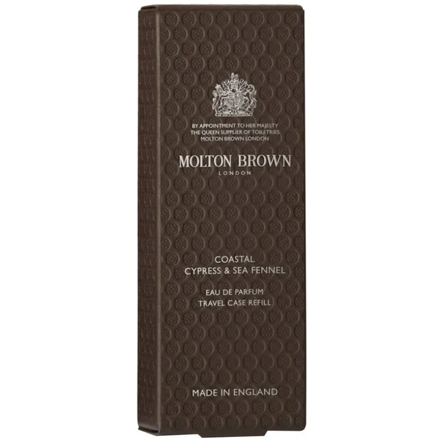 Coastal Cypress & Sea Fennel Eau De Parfum Travel Case Refill er en forfriskende, havinspirert Eau de Parfum. Duften åpner med aromatiske noter av fikentreblad og ingefær, som leder inn i et hjerte av sypress og jasmin, og avrundes med en rik base av lær og musk. Denne Eau de Parfum gir en følelse av uoppdaget friskhet, perfekt for å ta med deg uansett hvor du går, takket være den praktiske reiseflasken.