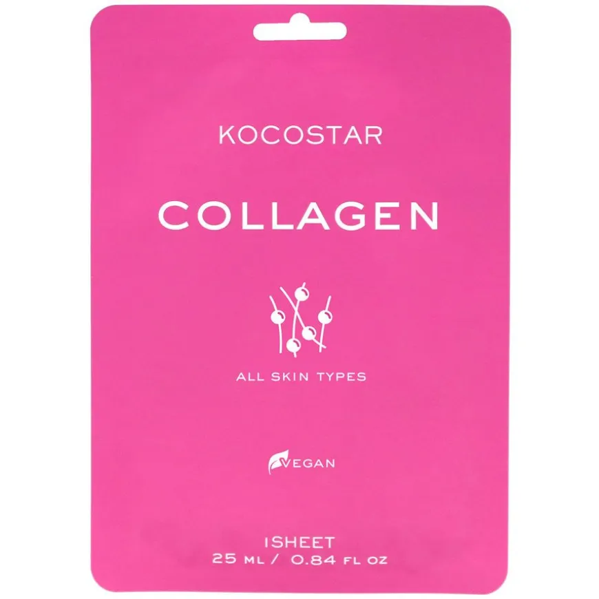 Collagen Sheet Mask er en sheet-mask fra Kocostar. Gi huden din forbedret elastisitet med denne kollagenmasken. Denne masken, som er formulert med plantekollagen fra ris, soyabønner, gulrot, quinoa og ginsengekstrakt, vil tilføre fuktighet og jevne ut huden din. Masken er laget av 100 % cellulosefiber som fester seg godt til huden og absorberer serumet effektivt. Enkel å påføre.