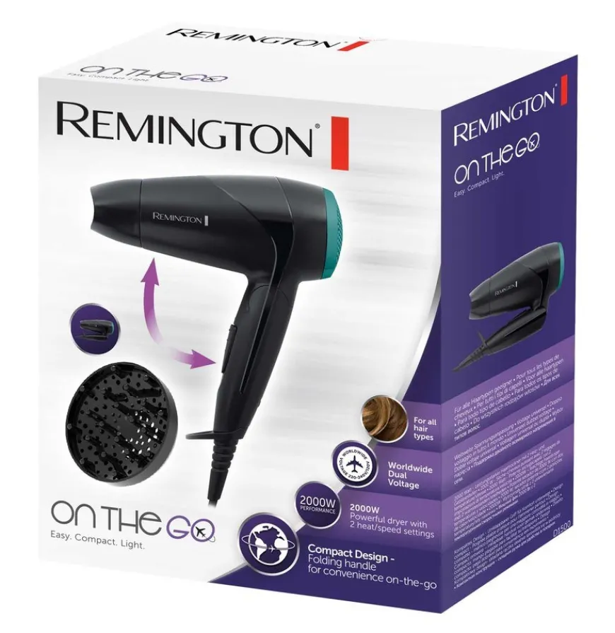 Remington Compact Dryer 2000 er en spesialutviklede kompakte hårføner utstyrt med et sammenleggbart håndtak og avtagbar diffuser, noe som gjør den ideell for å passe i enhver veske. Nå kan du lage din favorittstil uansett hvor du er takket være Remington On The Go Compact Dryer 2000, din perfekte reisefølge.