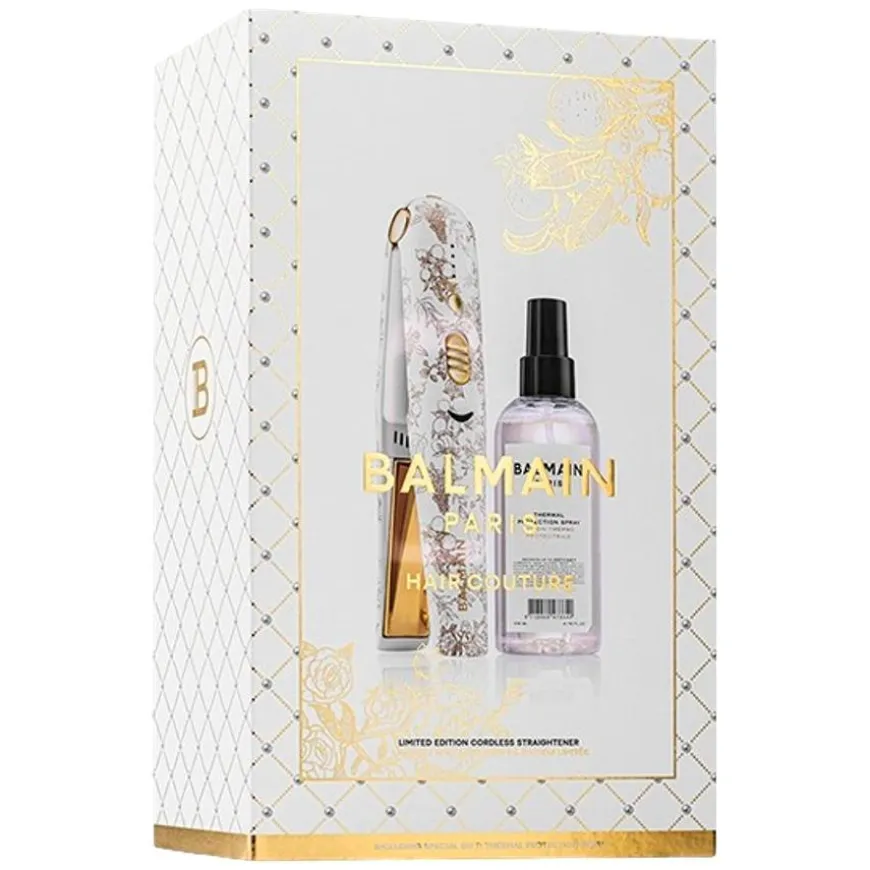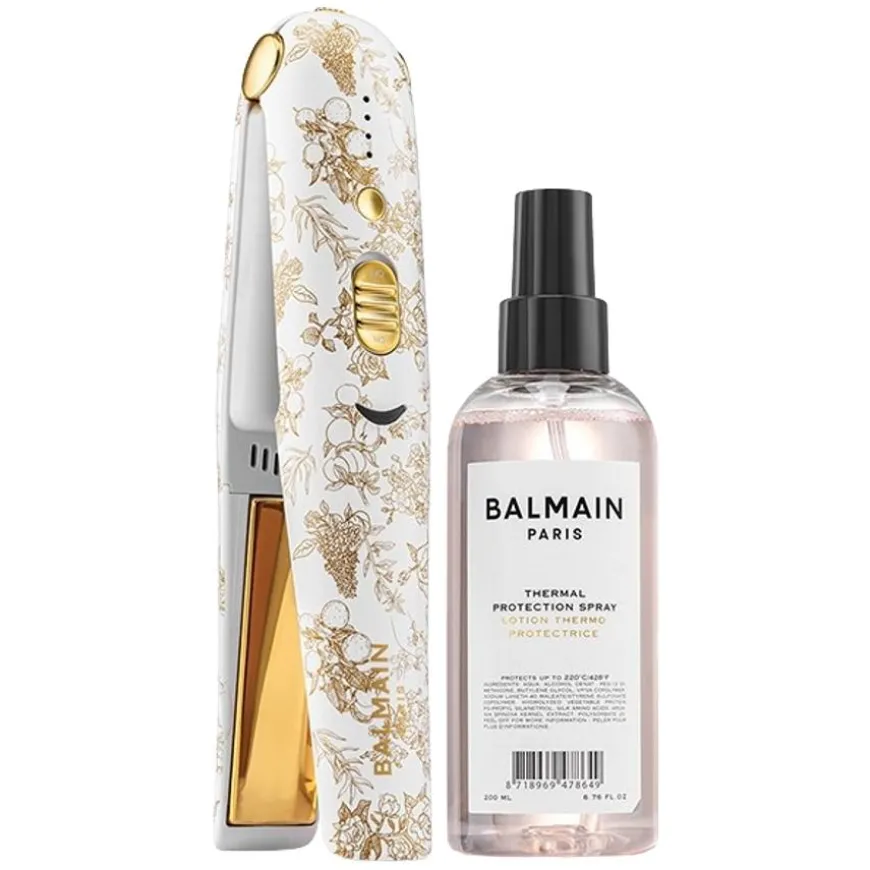 Dette eksklusive settet inkluderer det ikoniske trådløse rettetanget i en ny, raffinert design med gullfargede, blomsterinspirerte detaljer, samt Balmain Thermal Protection Spray, som beskytter håret under varmebehandling.