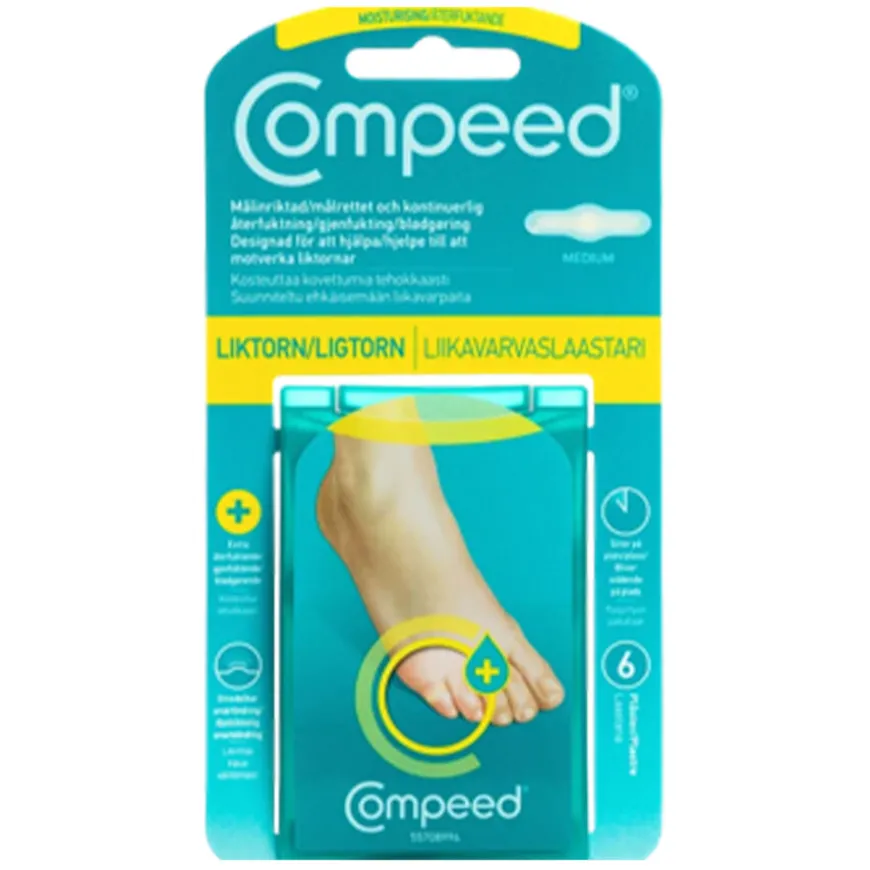 Compeed Corn Moist fuktighetsgivende liktornplaster gir lindring, trykkavlastning og kontinuerlig tilførsel av fuktighet. Inneholder aktiv hydrokolloidteknologi og gir øyeblikkelig smertelindring. Brukes plasteret forebyggende på belastede områder kan man dermed unngå smertefulle liktorner før de oppstår. Compeed mykgjørende liktornplaster er et hydrokolloid plaster for liktorn-behandling, som gir øyeblikkelig smertelindring ved liktorn og fortykket hud. Plasteret tilfører ekstra fuktighet, slik at liktornen mykes opp og kan fjernes raskere. Plasteret sitter i flere dager og gir avlastning mot trykk og friksjon. Plasteret er utviklet for å gjøre liktorn mindre smertefulle og lettere å fjerne, men vil også kunne bidra til å stoppe dannelsen av liktorn. Kan brukes forebyggende på belastede områder og hard hud, slik at man kan unngå smertefulle liktorner før de oppstår.