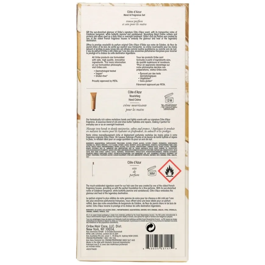 : Aqua/Water/Eau, Caprylic/Capric Triglyceride, Glycerin, Cetearyl Alcohol, Glyceryl Stearate, Propanediol, Hydrogenated Vegetable Oil, Myristyl Myristate, C15-19 Alkane, Cetearyl Olivate, Neopentyl Glycol Diheptanoate, Steareth-2, Butyrospermum Parkii (Shea) Butter, Tapioca Starch, Parfum/Fragrance, Behenyl Alcohol, Cetyl Alcohol, Phenoxyethanol, Sorbitan Olivate, Stearyl Alcohol, Tribehenin, Borago Officinalis Seed Oil, Limnanthes Alba (Meadowfoam) Seed Oil, Prunus Amygdalus Dulcis (Sweet Almond) Oil, Hydroxyethyl Acrylate/Sodium Acryloyldimethyl Taurate Copolymer, Ammonium Acryloyldimethyltaurate/VP Copolymer, Xanthan Gum, Sodium Phytate, Oryza Sativa (Rice) Bran Extract, Caprylyl Glycol, Panthenol, Pentaerythrityl Tetra-di-t-butyl Hydroxyhydrocinnamate, Sorbitan Isostearate, Helianthus Annuus (Sunflower) Extract, Polymethylsilsesquioxane, Aloe Barbadensis Leaf Juice, Rosmarinus Officinalis (Rosemary) Leaf Extract, Tocopherol, Tocopheryl Acetate, Sodium Hyaluronate, Citric Acid, Aminomethyl Propanol, Limonene, Hexyl Cinnamal, Citral, Linalool.; Côte d’Azur Eau de Parfum: SD Alcohol 40-B (Alcohol Denat.), Parfum/Fragrance, Aqua/Water/Eau, Limonene, Hexyl Cinnamal, Linalool, Citral, Citronellol, Cinnamal, Geraniol, Farnesol.