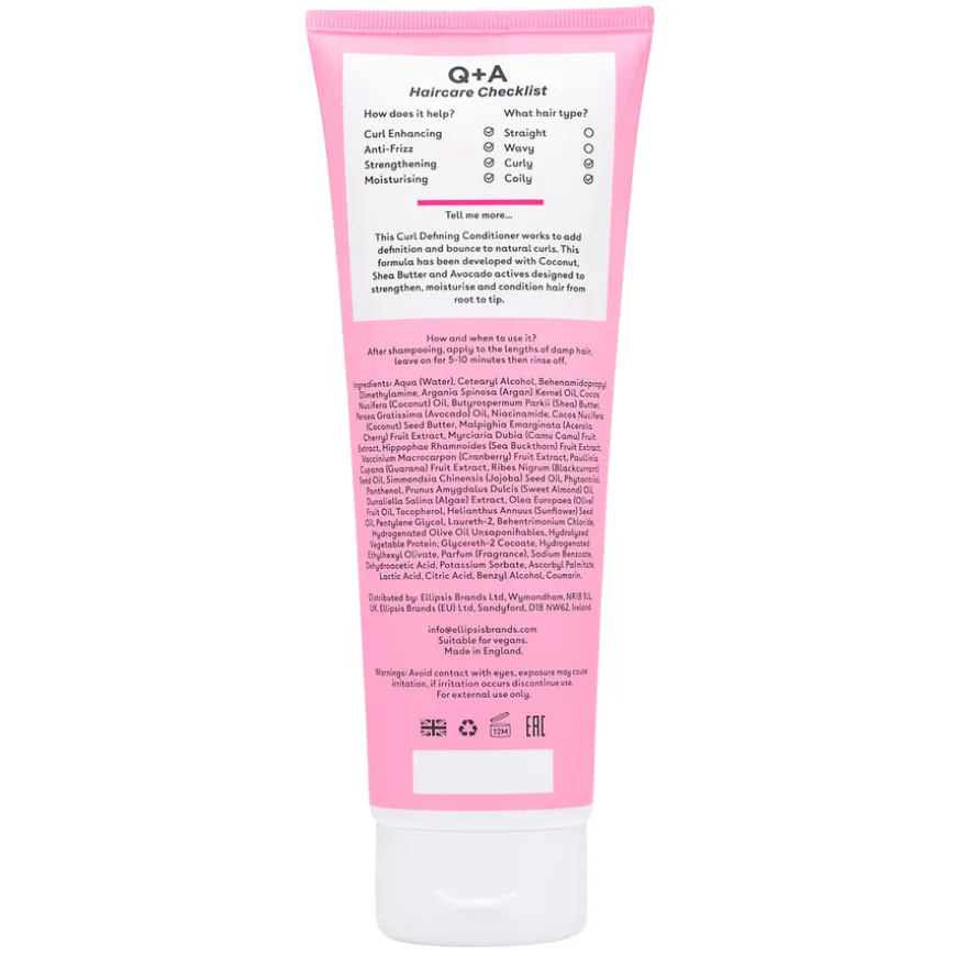 Curl Defining Conditoner fra Q+A er en balsam som gir fuktighet, definisjon og spenst til naturlige krøller. Formulert med avokado ekstrakt, shea-smør og kokosolje som gir håret rikelig med næring, fukt og glans -uten å tynge krøllene. Sammen med avokado ekstrakt styrkes håret fra rot til tupp med masse næring som gjør krøllene silkemyke og definerte.