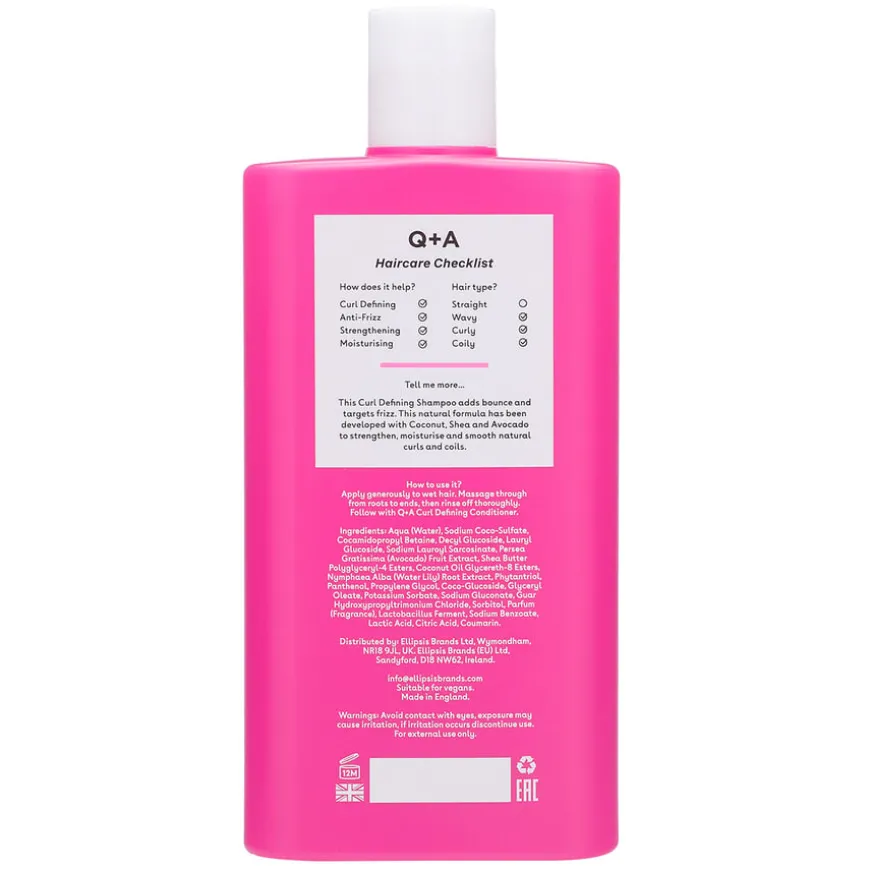 Curl Defining Shampoo fra Q+A er en Shampoo som gir definisjon og spenst til naturlige krøller. Formulert med avokado ekstrakt, shea-smør og kokosolje som gir håret rikelig med næring, fuktighet og glans. Sheasmør og kokosolje gir håret rikelig med fuktighet og glans, uten å tynge krøllene. Sammen med avokado ekstrakt styrkes håret fra rot til tupp med masse næring som gjør krøllene silkemyke og definerte.