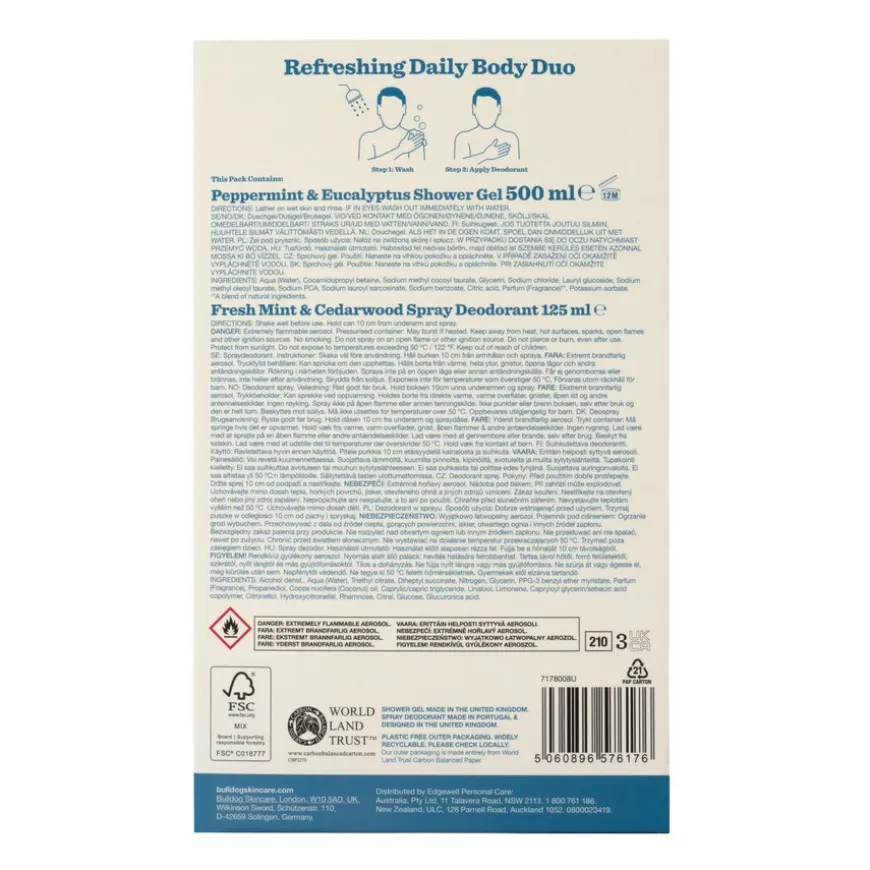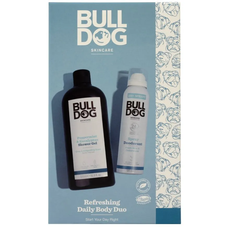 Start dagen på best mulig måte med Bulldog Refreshing Daily Body Duo, et gaveeske med en komplett kroppspleierutine for menn, som inneholder friske produkter: Peppermint & Eucalyptus Shower Gel og Fresh Mint & Cedarwood Spray Deodorant.