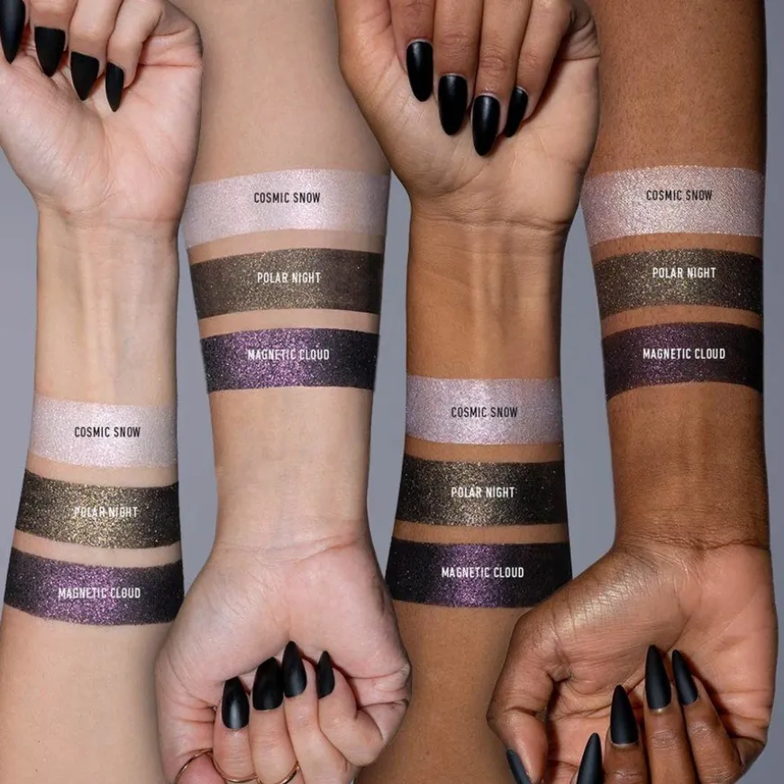 Dazzle Flakes er en metallisk øyeskygge med prismatiske flak som smelter på øyelokkene, og legger seg som et fint lag med kosmisk skimmer. Det er det samme skimmeret som er i Dazzle Sticks fra KVD Beauty, men i en allsidig våt/tørr, løs pigmentert formula for et intenst metallisk uttrykk. Du kan bruke Dazzle Flakes våt eller tørr, alene eller som siste touchen på din øyenskygge. Kreativiteten har ingen grenser! Flakene ruller seg sammen til små klynger i krukken slik at de enkelt kan tas opp med fingrene eller en pensel. Dazzle flakes er inspirert av polare stormer og nordlys.