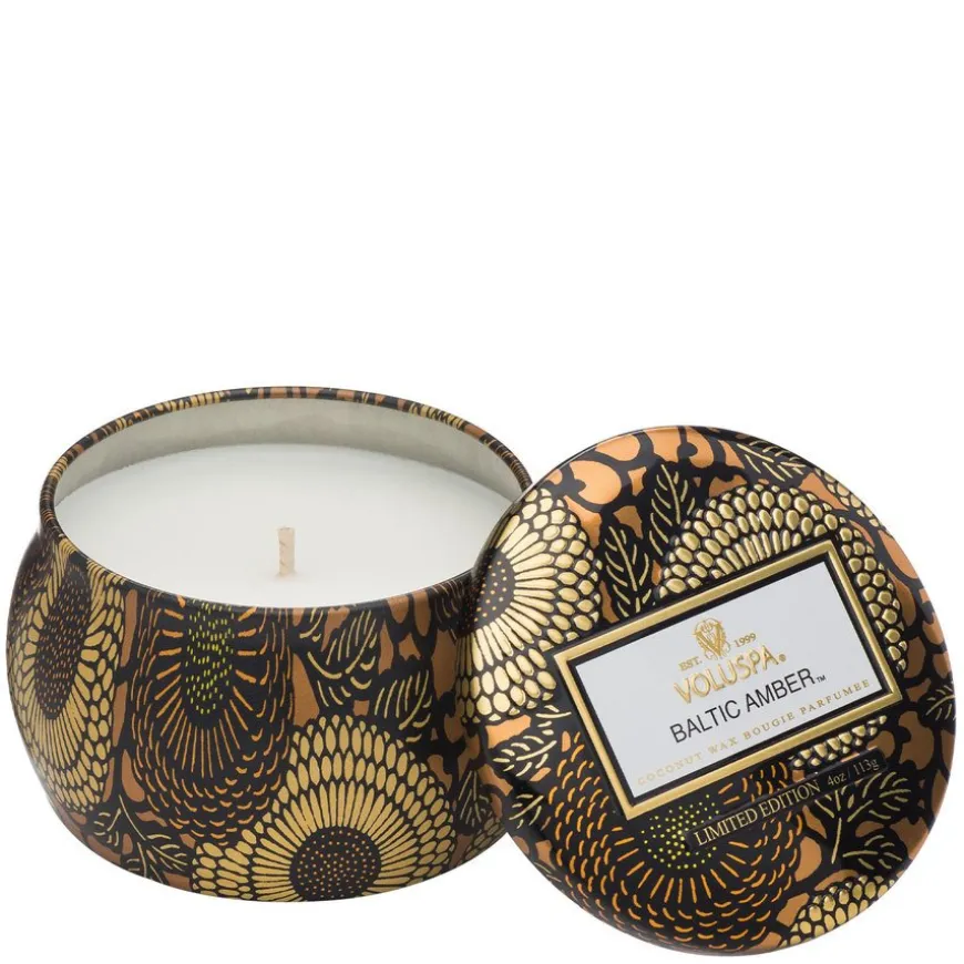 Baltic Amber Decorative Tin Candle fra Voluspa med duft av rav, sandeltre og vanilje. En nydelig tinnboks med japansk-inspirert design.