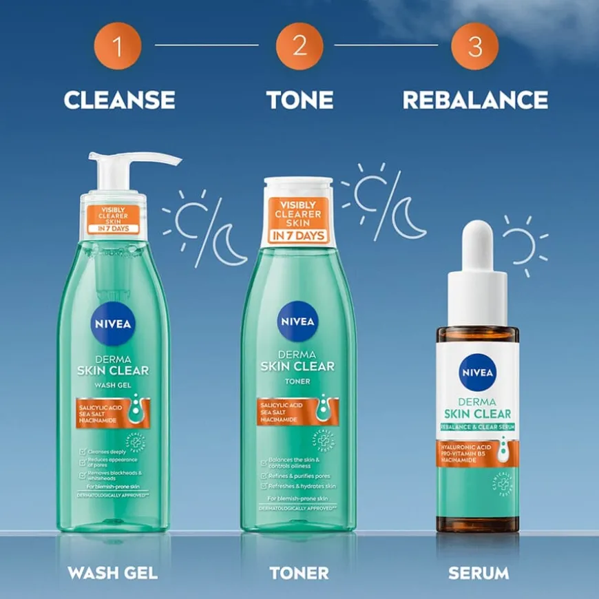 Oppgrader renserutinen og ta kontrollen over akneutsatt hud med NIVEA Derma Skin Clear Toner. Ansiktsvannet balanserer og fukter huden uten å tette porene. Denne NIVEA-toneren gir synlig bedre hud på bare 7 dager. Ansiktstoneren har en formel med salisylsyre og niacinamid som bidrar til å forebygge urenheter og rengjøre fet hud uten å tette porene. Ansiktsrensen er en del av Derma Skin Clear-sortimentet. Bruk denne NIVEA-toneren sammen med hele sortimentet for hvert trinn i hudpleierutinen. Klinisk testet (hudkompatibilitet og effekt på flekker i huden testet i klinisk studie). Vegansk formel – ingen animalske ingredienser. 98 % rPET-flaske (ekskl. lokk og etikett).