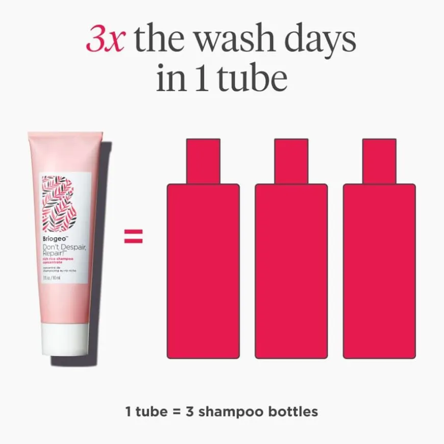 Don’t Despair Repair Rich Rice Shampoo Concentrate er en vannaktivert behandlingsshampoo som er formulert spesielt for svært tørt og skadet hår. Den unike formelen inneholder en optimal balanse av risprotein og fuktighet, og aktiveres i kontakt med vann for å danne et pleiende skum. Med Advanced Rice Protein Complex – som består av risvann, protein, ferment og olje – styrker den håret og beskytter mot fremtidig skade og brekkasje. Nypeolje og søtmandelolje tilfører dyptvirkende næring, mens vitamin B5 og biotin støtter sunn elastisitet. Produktet er 3 ganger mer konsentrert enn tradisjonelle shampooer og er pakket i en bærekraftig, resirkulerbar aluminiumstube. Passer alle hårtyper, inkludert de med tørt, skadet eller behandlet hår.