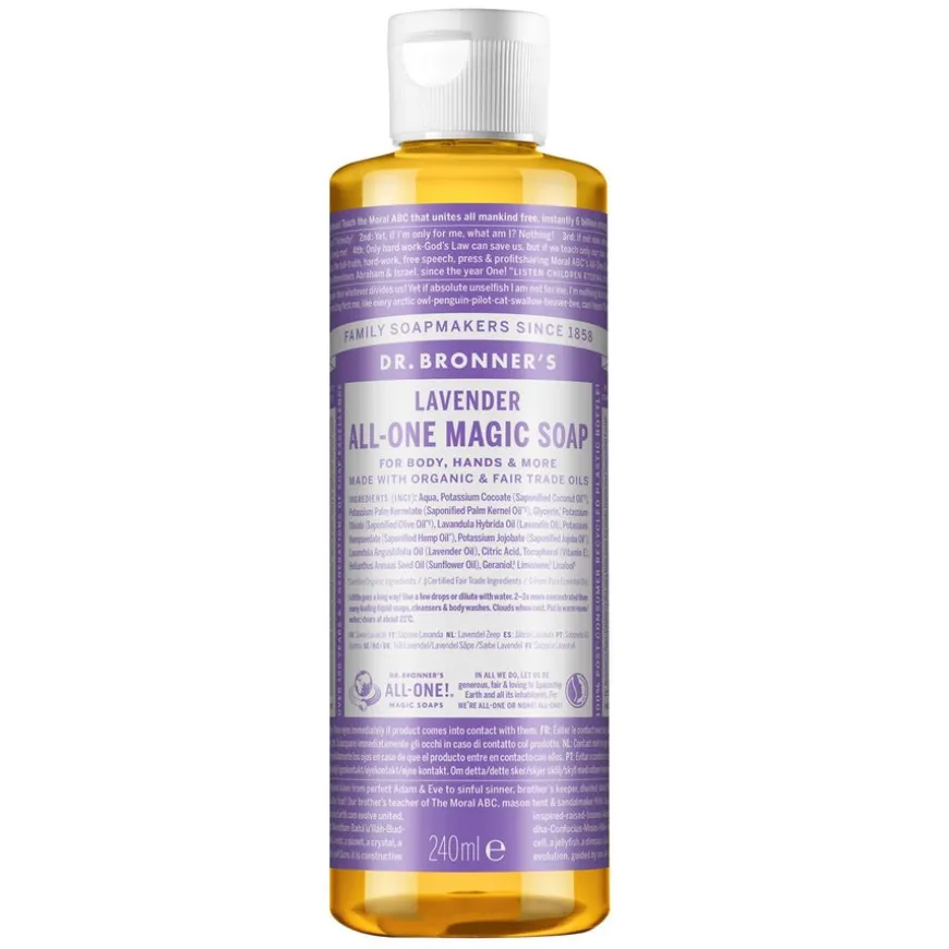 18-In-1 Pure Castile Soap Lavender er en duftende og allsidig vegansk såpe laget av naturlige økologiske kokos, oliven, palmekjerne, hamp og jojobaolje. Kombinasjonen av økologiske oljer sammen med rene eteriske oljer gir en såpe som rengjør effektivt og skånsomt, og etterlater huden silkemyk og forfrisket. Denne allsidige såpen kan brukes til ansikt, hender, hår og hele kroppen. I tillegg kan den blandes ut med vann for rengjøring av gulv og overflater, samt brukes som oppvaskmiddel. Laget med økologiske og sertifiserte fair trade ingredienser.